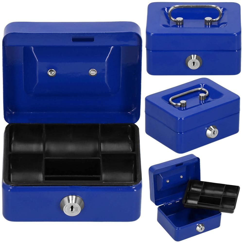 Caseta pentru bani tip cutie de valori, compartimentanta, cu cheie, metal, 12.5×9.5×6.5cm, albastru Mob360