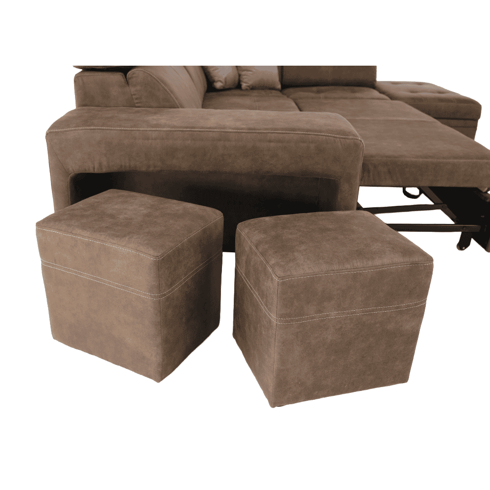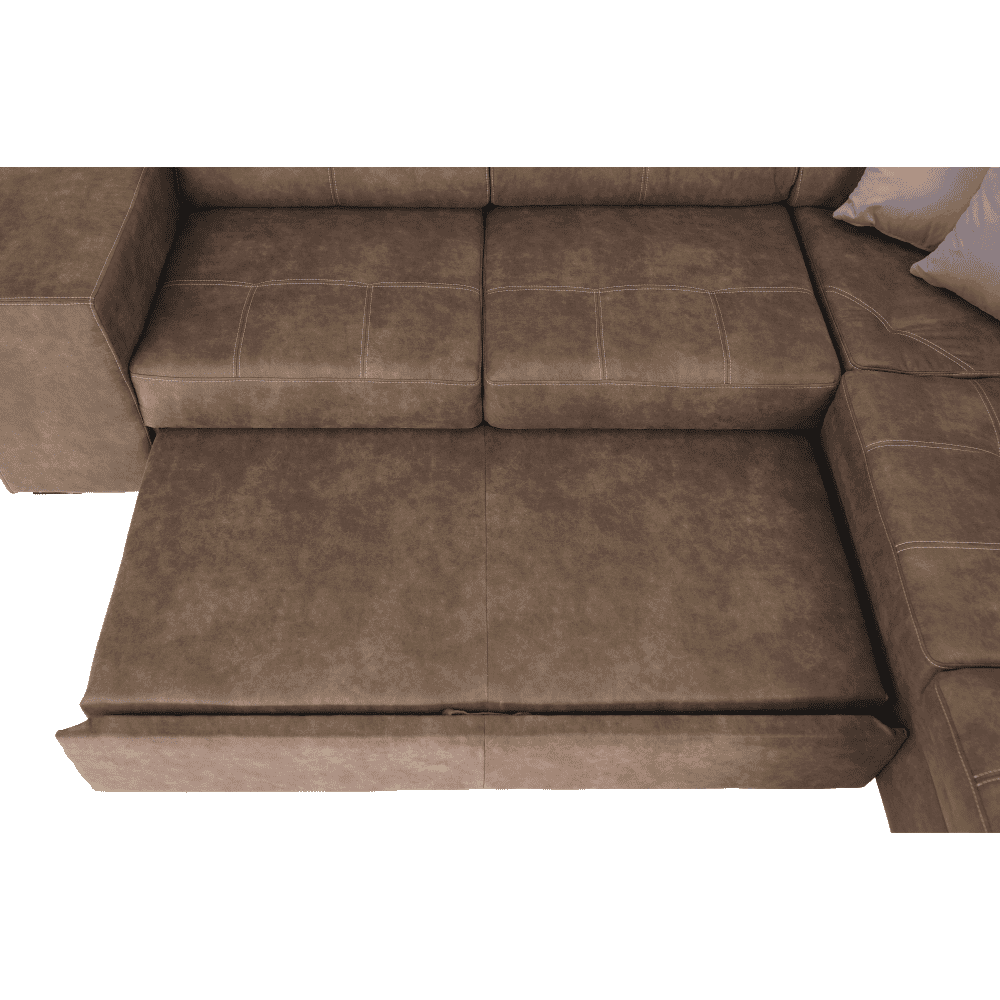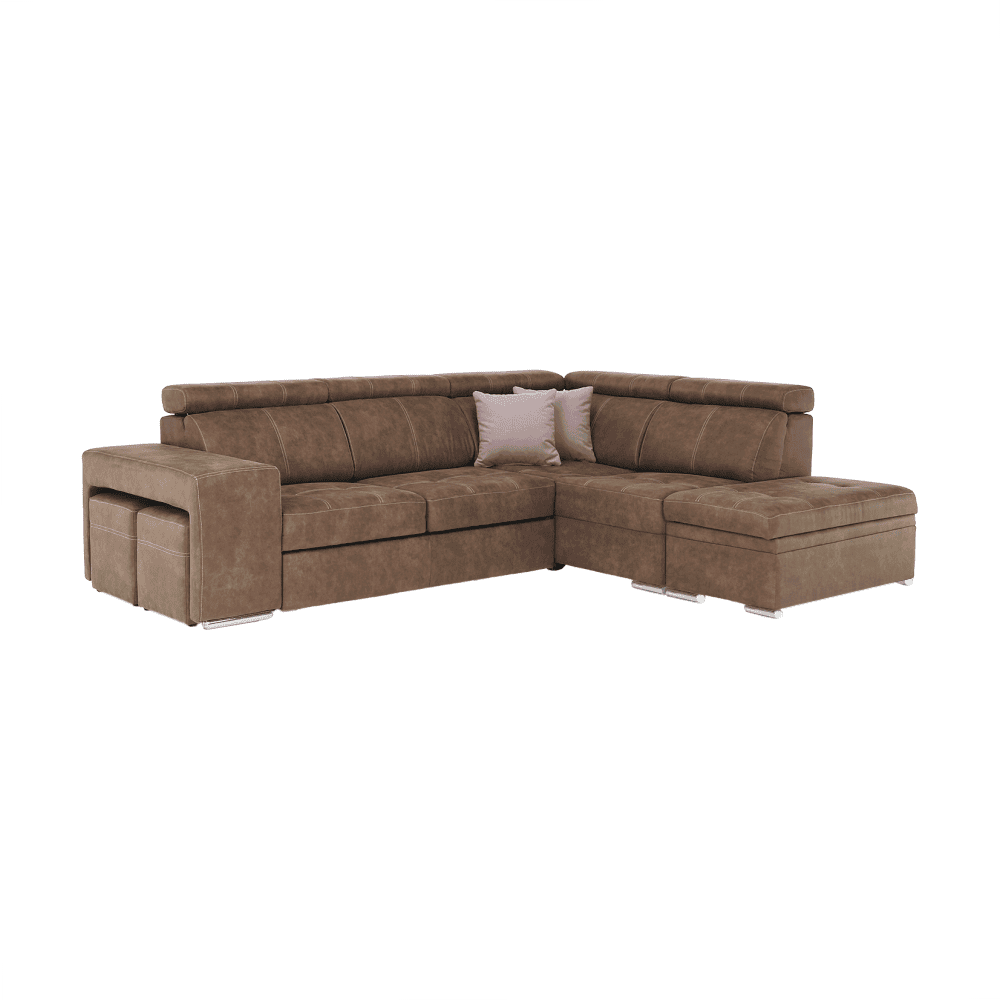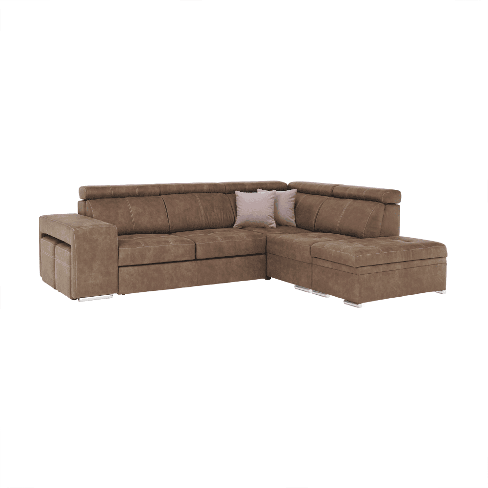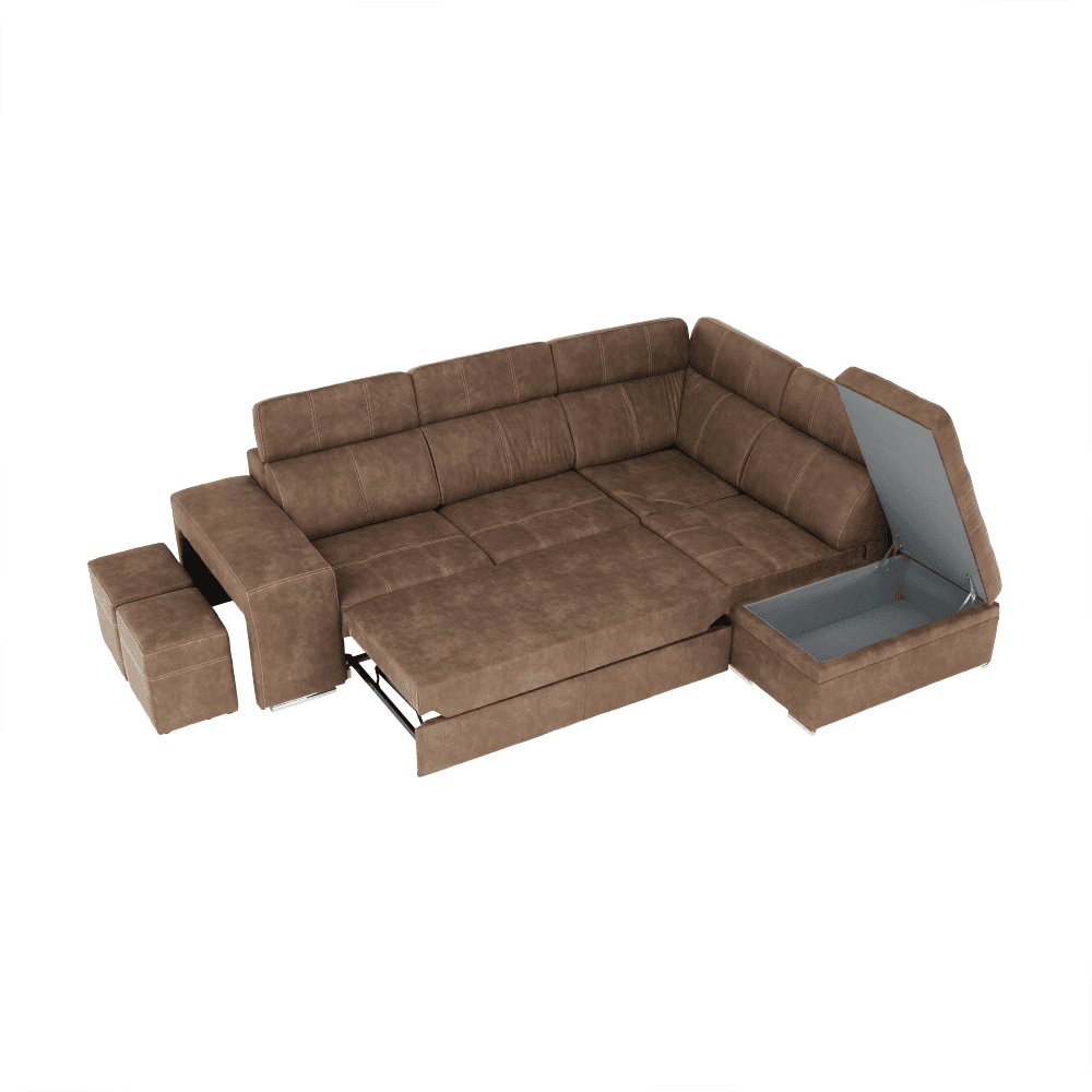 Colţar extensibil tapiţat, cu loc de depozitare şi tetiere reglabile.