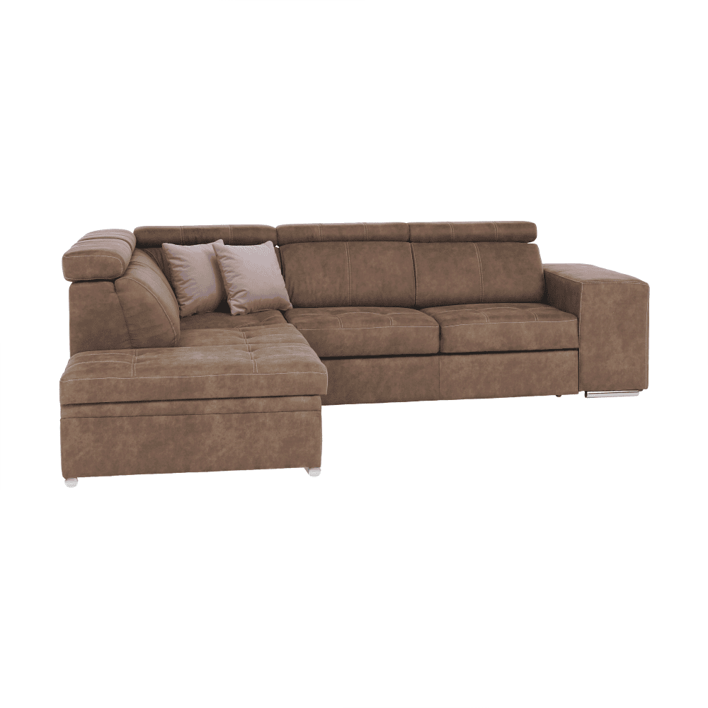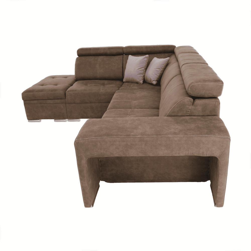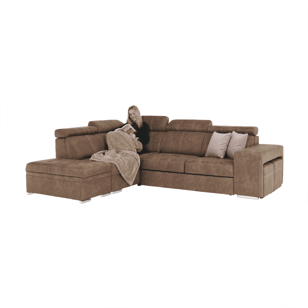 Colţar extensibil tapiţat, cu loc de depozitare şi tetiere reglabile.