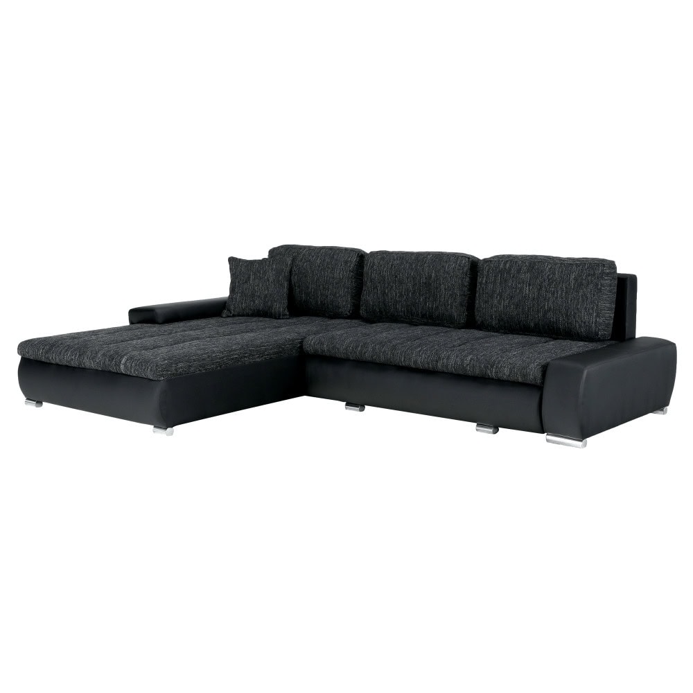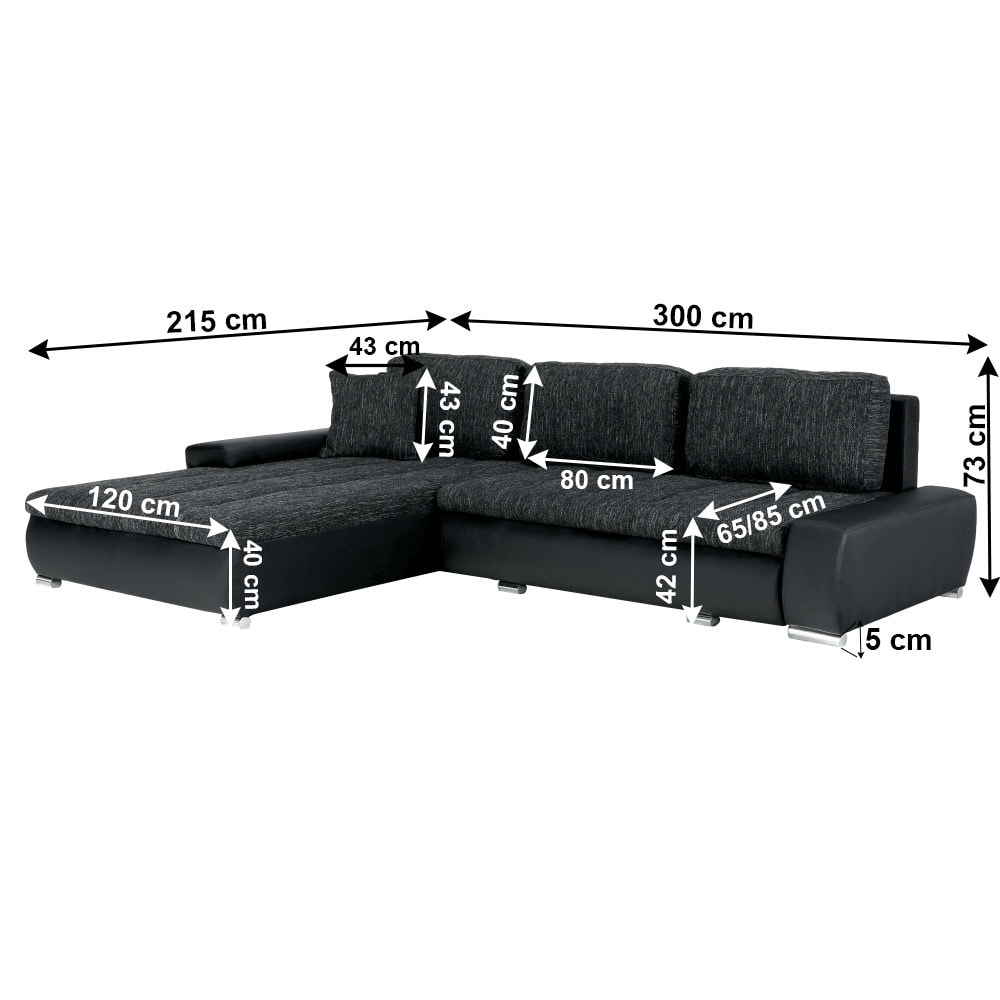 Colţar extensibil, tapiţat, universal (S/D) cu spaţiu pt. depozitare, material: piele eco 1100 negru/material Nevada 10 negru şuviţat. Dimensiuni (LxGxÎ): 300x215x73 cm, Spaţiu pt. dormit (LxGŞ) 150×240 cm, Înălţimea şi adâncimea şezutului: 42×65/85 cm.