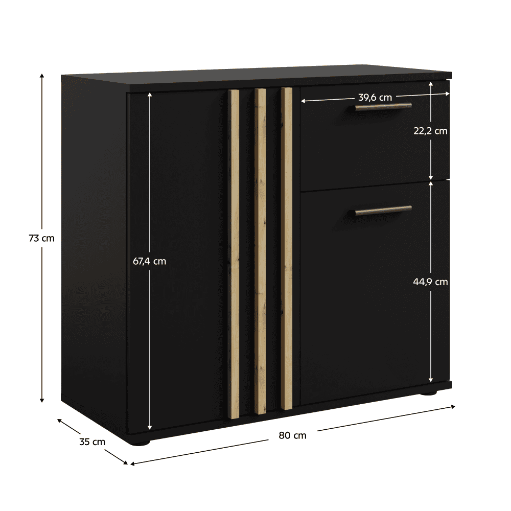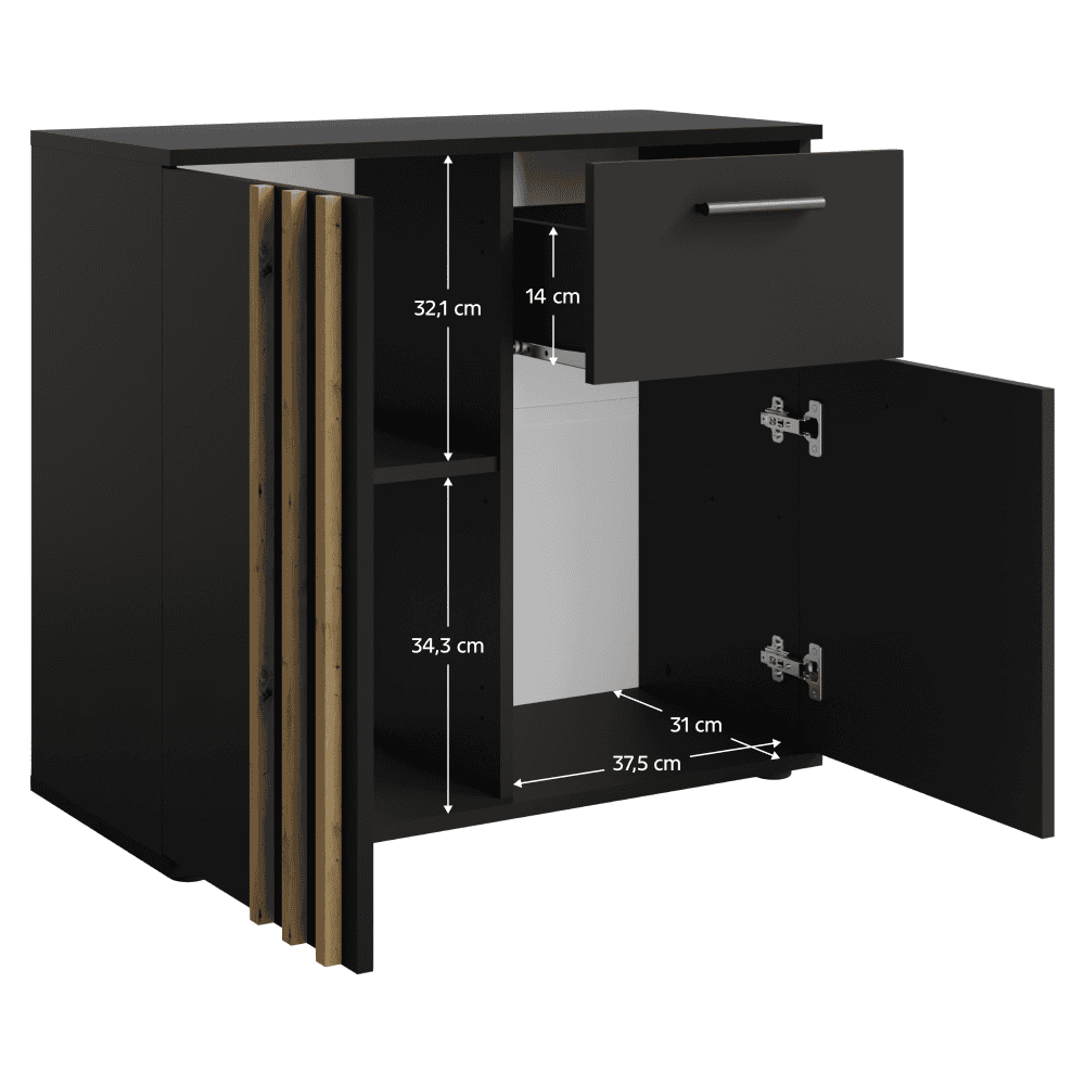 Material: DTD laminat/MDF Culoare: neagră/stejar artisan Dimensiuni (lxAxh): 80x35x73 cm Grosime material: 1,6 cm Grosimea lamelei: 1,6 cm. Lăţimea lamelei: 1,8 cm Cu două uşi Cu poliţă Portanţă poliţă: 5 kg Cu sertar Portanţă sertar: 5 kg Portanţă spaţiu de depozitare: 10 kg Mâner numai pe o parte a uşii Material mâner: MDF Culoare mâner: neagră Livrat cu lamele decorative Stil modern Livrat dezasamblat
