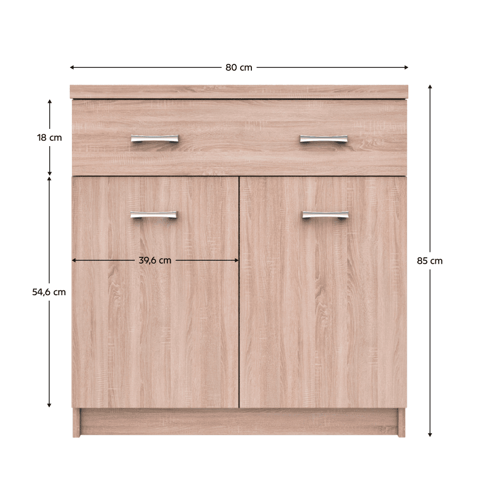 Comodă 2D1S TOPTY TIP 19 Material: PAL melaminat Culoare: stejar Sonoma Dimensiuni (LxAxÎ): 80x33x85 cm Dimensiuni uşă (LxL): 39,6×54,6 cm Dimensiuni sertar (LxL): 80×18 cm 2 uşi Un sertar Raft Livrat dezasamblat