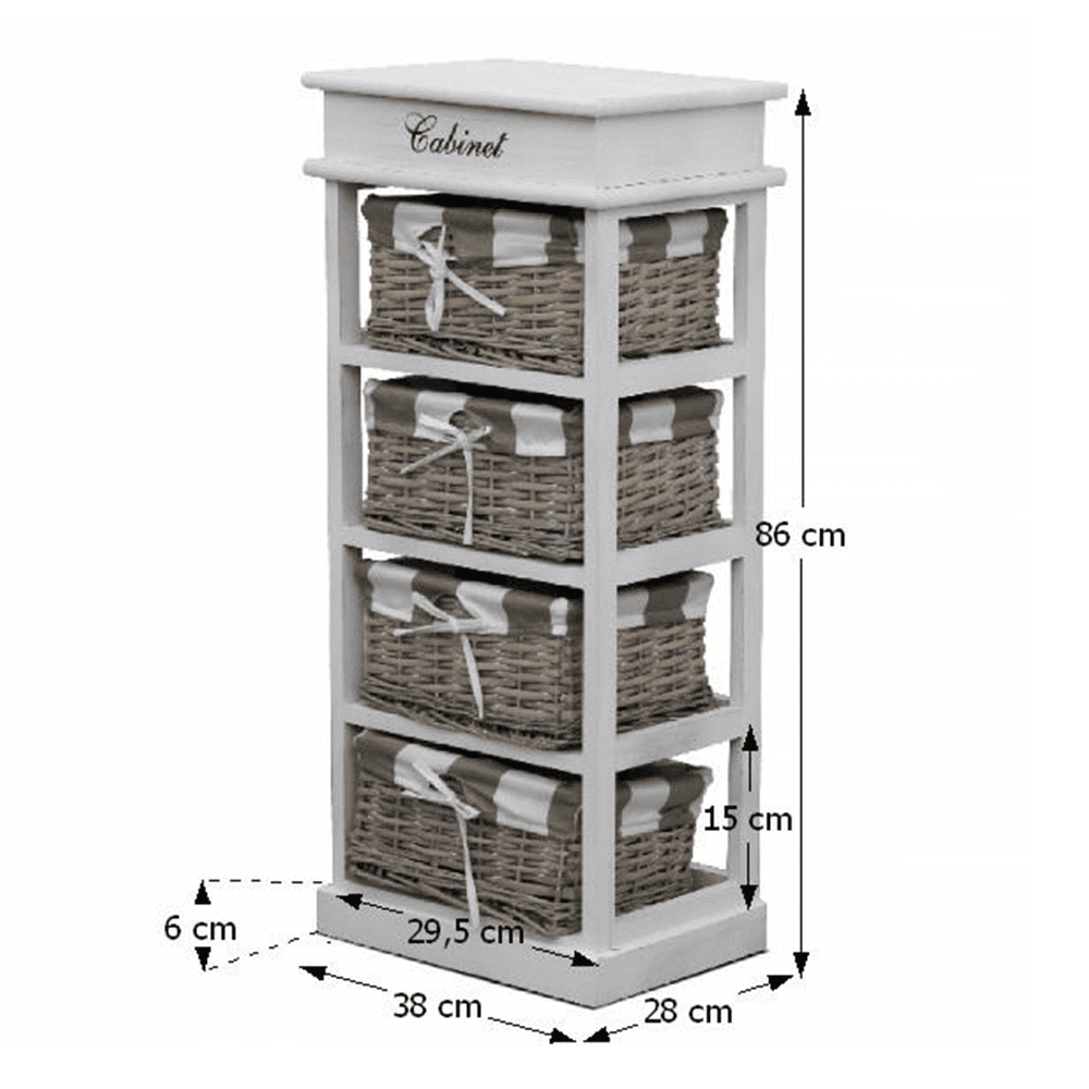 Comodă cu 4 coşuri de răchită într-un cadru solid din lemn,