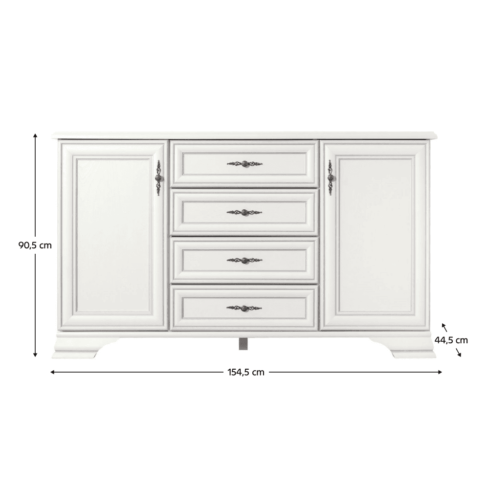 Material: DTD laminat Culoare: alb alpin Dimensiuni (lxAxh): 154,5×44,5×90,5 cm Grosime material: 1,6 cm Mânere metalice Culoarea mânerului: argintiu antic Sertare Portanţă sertar: 3 kg Cu două uşi Poliţe Portanţă poliţă: 4 kg Portanţă placă superioară: 15 kg. Pe picioare. Înălţime picioare: 8 cm Livrat dezasamblat