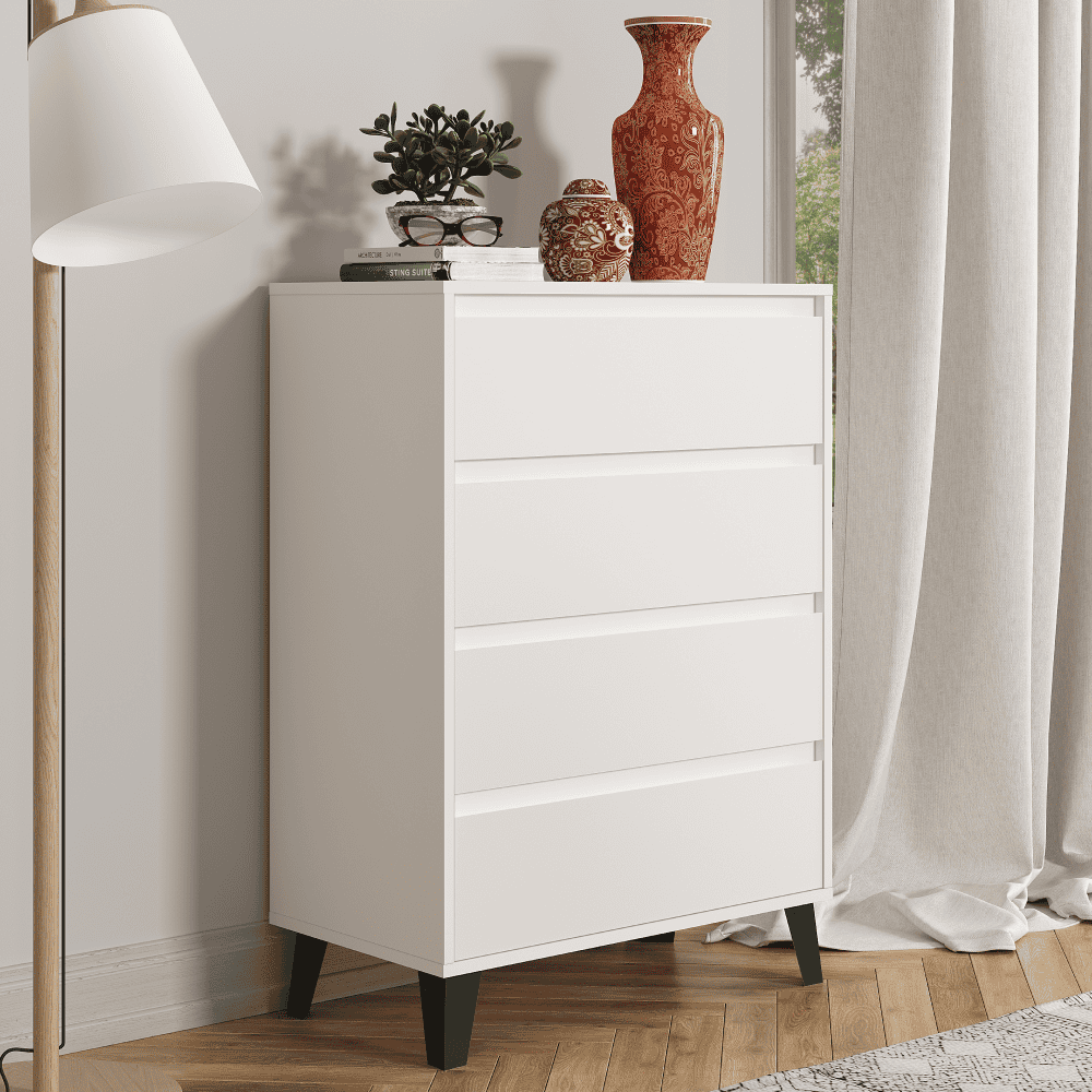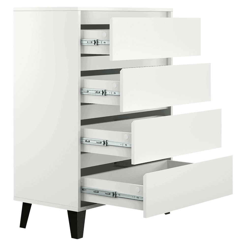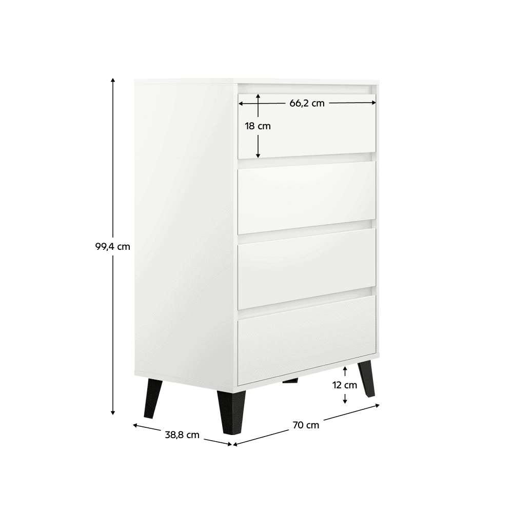 Material: DTD laminat Culoare: albă Dimensiuni (Lxlxh): 70×38,8×99,4 cm Înălţimea spaţiului inferior de la podea: 12 cm Patru sertare Dimensiunea sertarului (Lxh): 66,2×18 cm Dimensiunea interioară a sertarului (Lxlxh): 60,8×33,3×9 cm Pe picioare Culoare picior: negru Portanţă sertar: 5 kg Portanţa plăcii superioare: 15 kg Design modern Fără mânere Vă recomandăm să ataşaţi mobilierul de perete Livrat dezasamblat