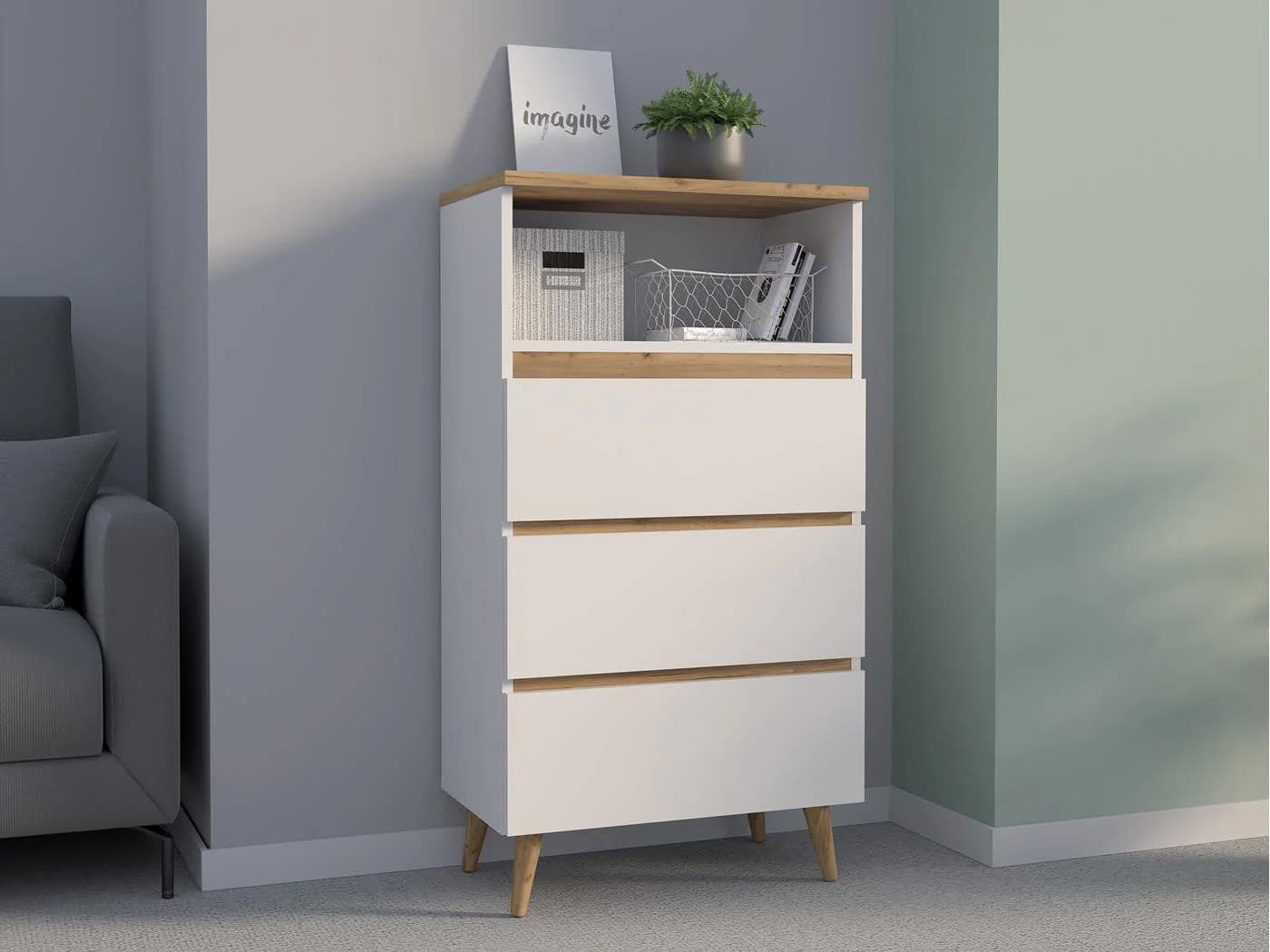 Comoda biblioteca Norge 03 cu 3 sertare si raft deschis, 65x37x119 cm, alb si stejar craft Mob360