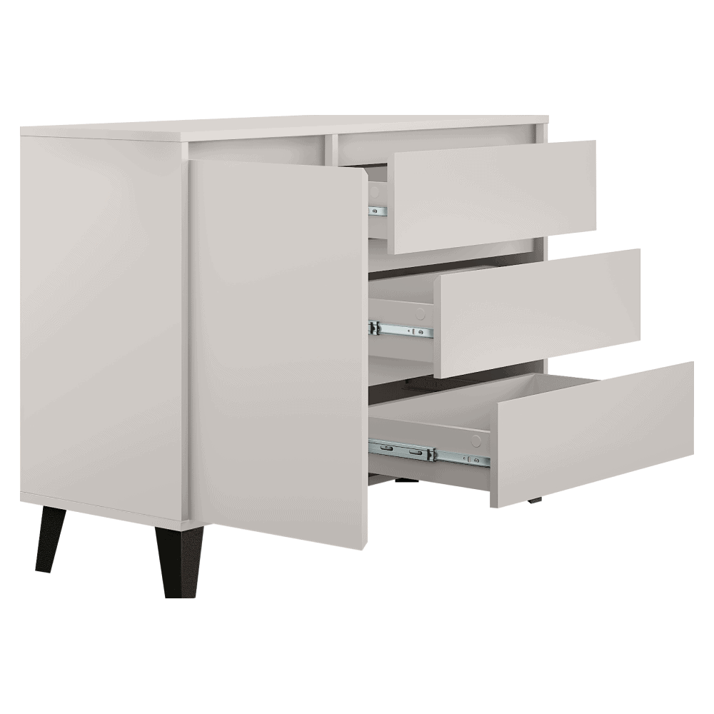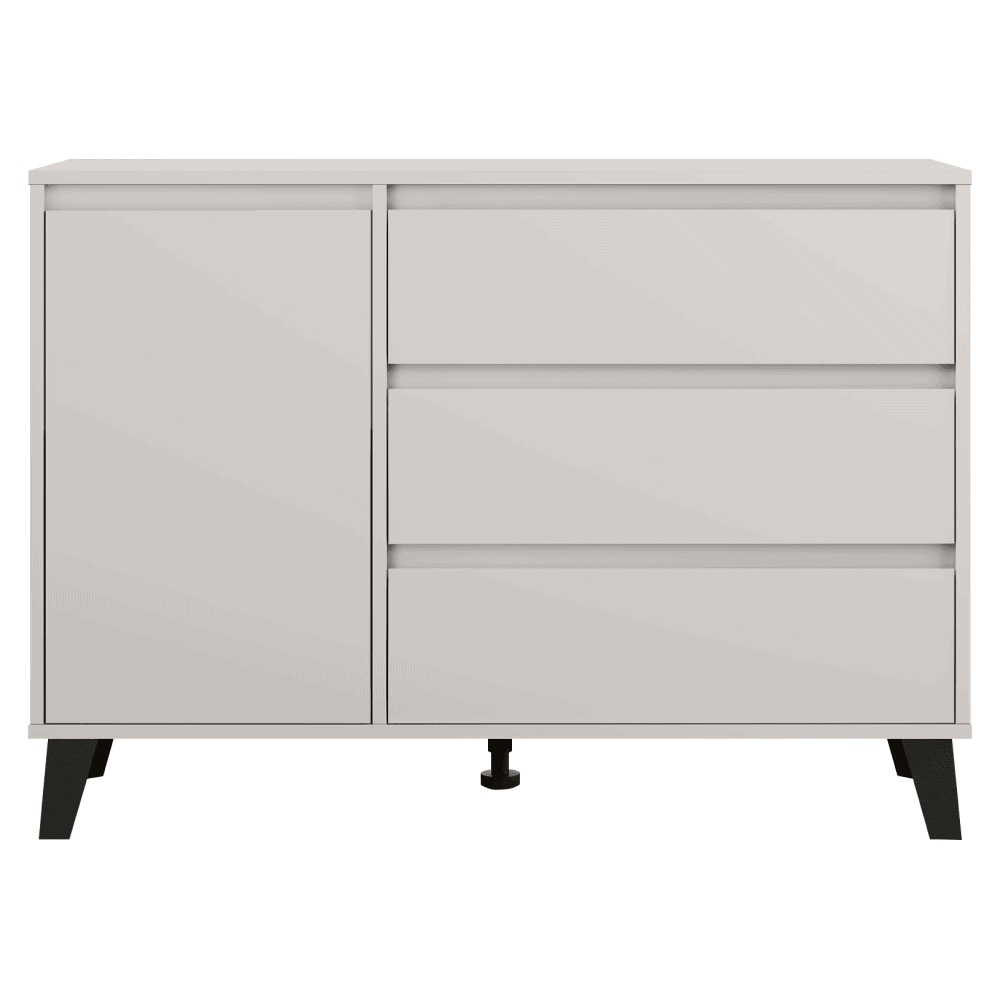 Material: DTD laminat Culoare: caşmir Dimensiuni (Lxlxh): 110×38,8×78,4 cm Înălţimea spaţiului inferior de la podea: 12 cm Universal cu o uşă Trei sertare Dimensiunea sertarului (Lxh): 66,2×18 cm Dimensiunea interioară a sertarului (Lxlxh): 60,8×33,3×9 cm Pe picioare Culoare picior: negru Portanţă sertar: 5 kg Portanţa plăcii superioare: 10 kg Cu poliţe Stil modern Fără mânere Recomandat pentru montare pe perete Livrat dezasamblat