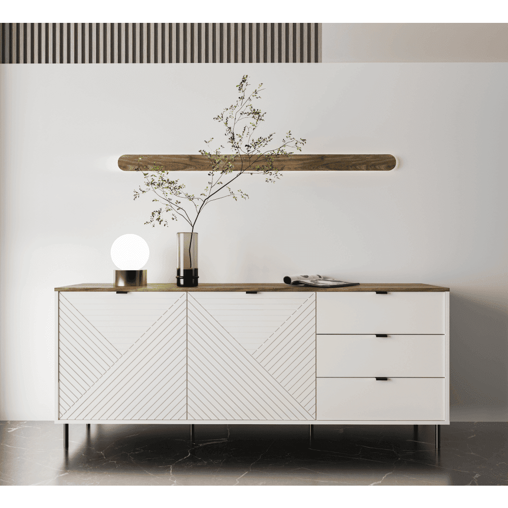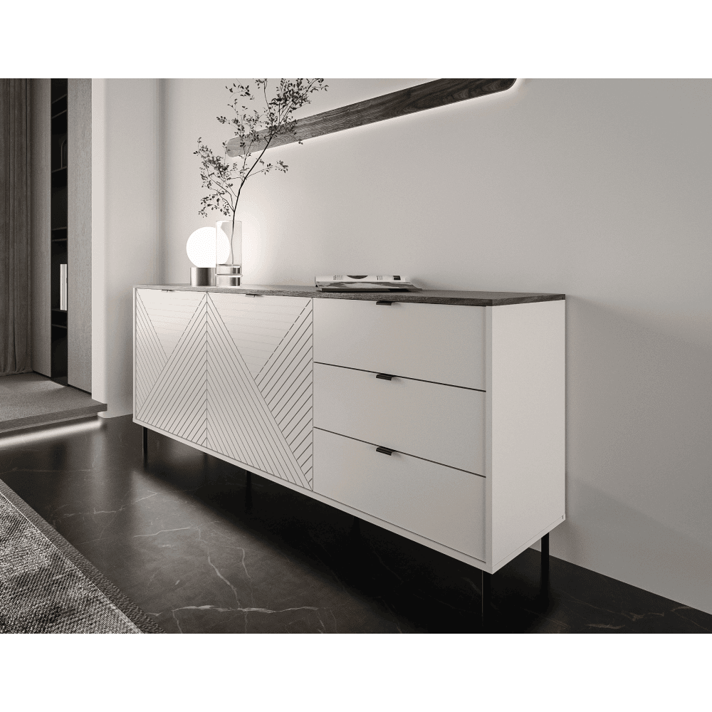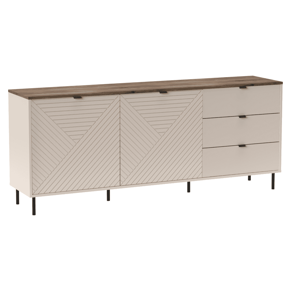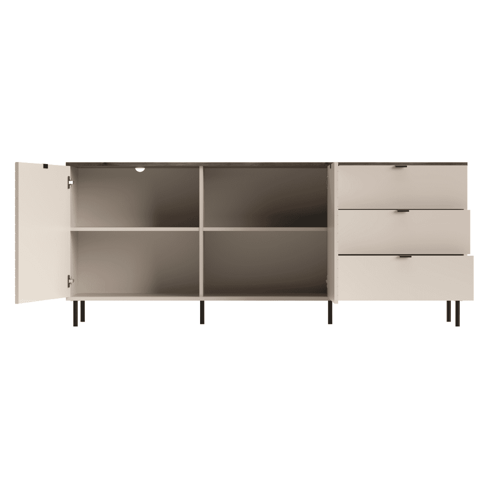 Material: DTD laminat/MDF înfoliat/margini ABS Culoare: caşmir/stejar castello Dimensiuni (Lxlxh): 183,4x40x75,2 cm Grosimea materialului: 1,6 cm Cu două uşi Două dulăpioare Dimensiuni dulăpior (Lxh): 59,6×59,6 cm Poliţă Trei sertare Dimensiuni sertar (Lxh): 59,6×19,6 cm Cu mânere Material mânere: metal Culoare mânere: negru Pe picioare Material picioare: metal Culoare picioare: negru Înălţime picioare: 12 cm Portanţă placă superioară: 10 kg Portanţa poliţă: 5 kg Portanţă sertar: 3 kg Uşi decorative Design modern Vă recomandăm să-l fixaţi de perete Livrat dezasamblat