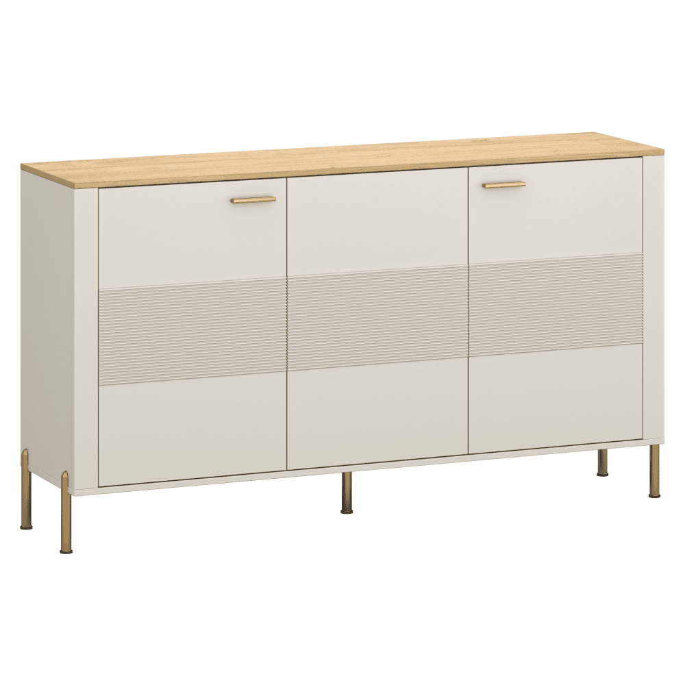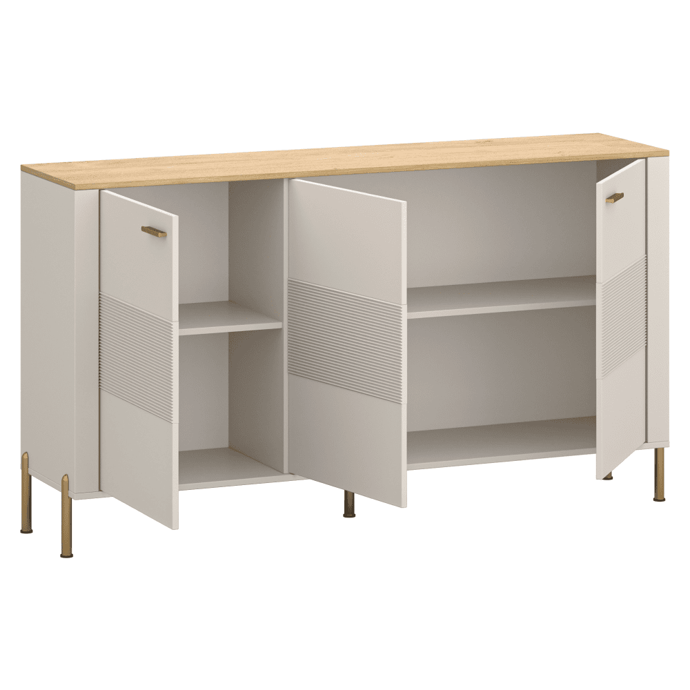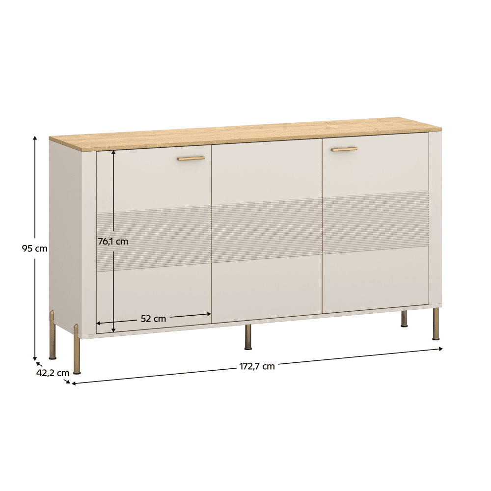 Material: DTD laminat/MDF înfoliat/PVC Culoare: caşmir/stejar de piatră Dimensiuni (lxAxh): 172,7×42,2×95 cm Grosimea materialului: 1,6 cm Cu trei uşi Dulăpior cu uşă Dimensiuni uşă (lxh): 52×76,1 cm Cu poliţă Portanţă poliţă: 3 kg Cu ??mâner Material mâner: metal Culoare mâner: auriu Pe picioare Material picior: metal Culoare picior: aurie Înălţime picior: 15 cm Uşă frezată decorativ Design modern Recomandăm fixarea de perete Livrat dezasamblat