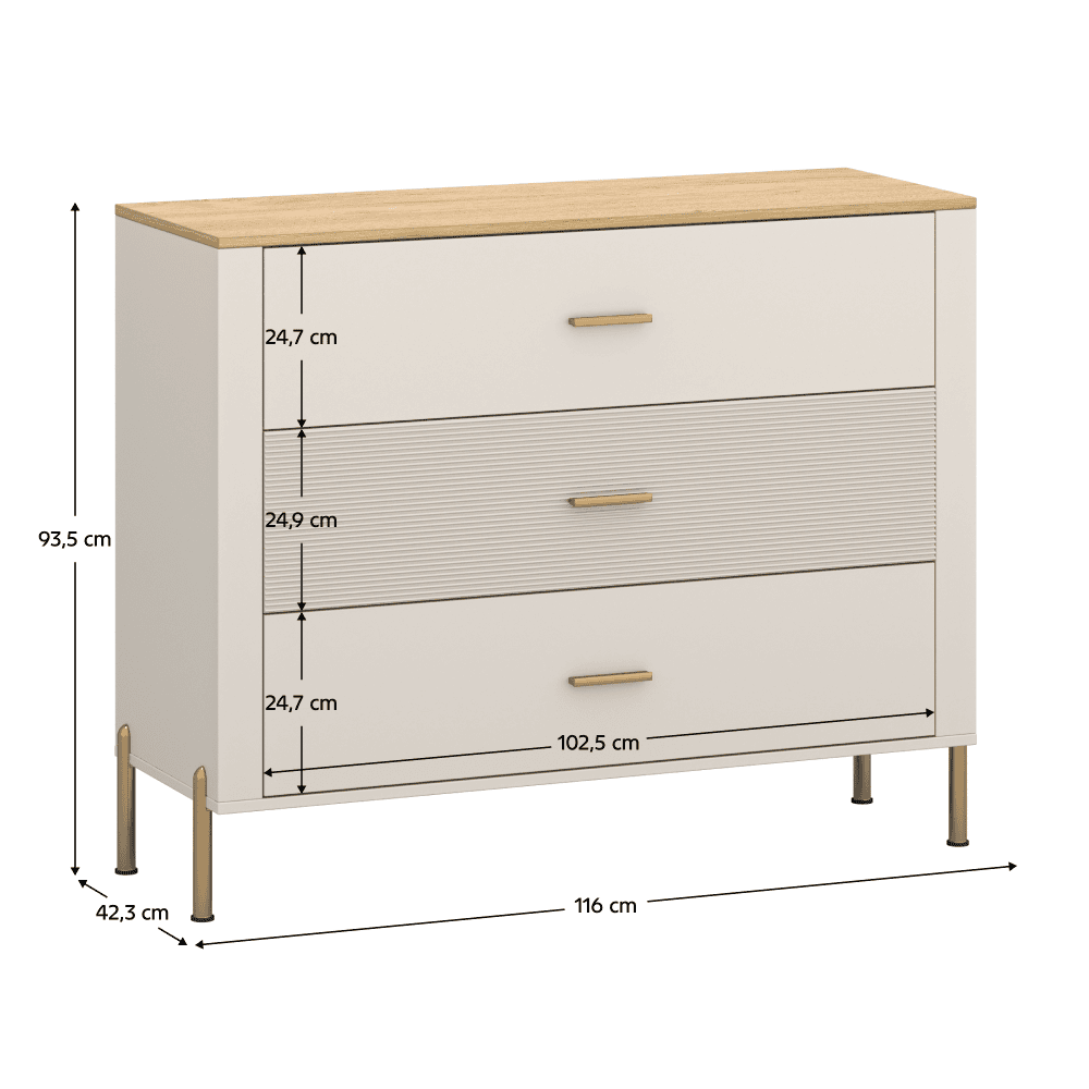Material: DTD laminat/MDF înfoliat/PVC Culoare: caşmir/stejar de piatră Dimensiuni (lxAxh): 116×42,3×93,5 cm Grosimea materialului: 1,6 cm Trei sertare Portanţă sertar: 3 kg Cu ??mâner Material mâner: metal Culoare mâner: auriu Pe picioare Material picior: metal Culoare picior: aurie Înălţime picior: 15 cm Uşă frezată decorativ Design modern Recomandăm fixarea de perete Livrat dezasamblat