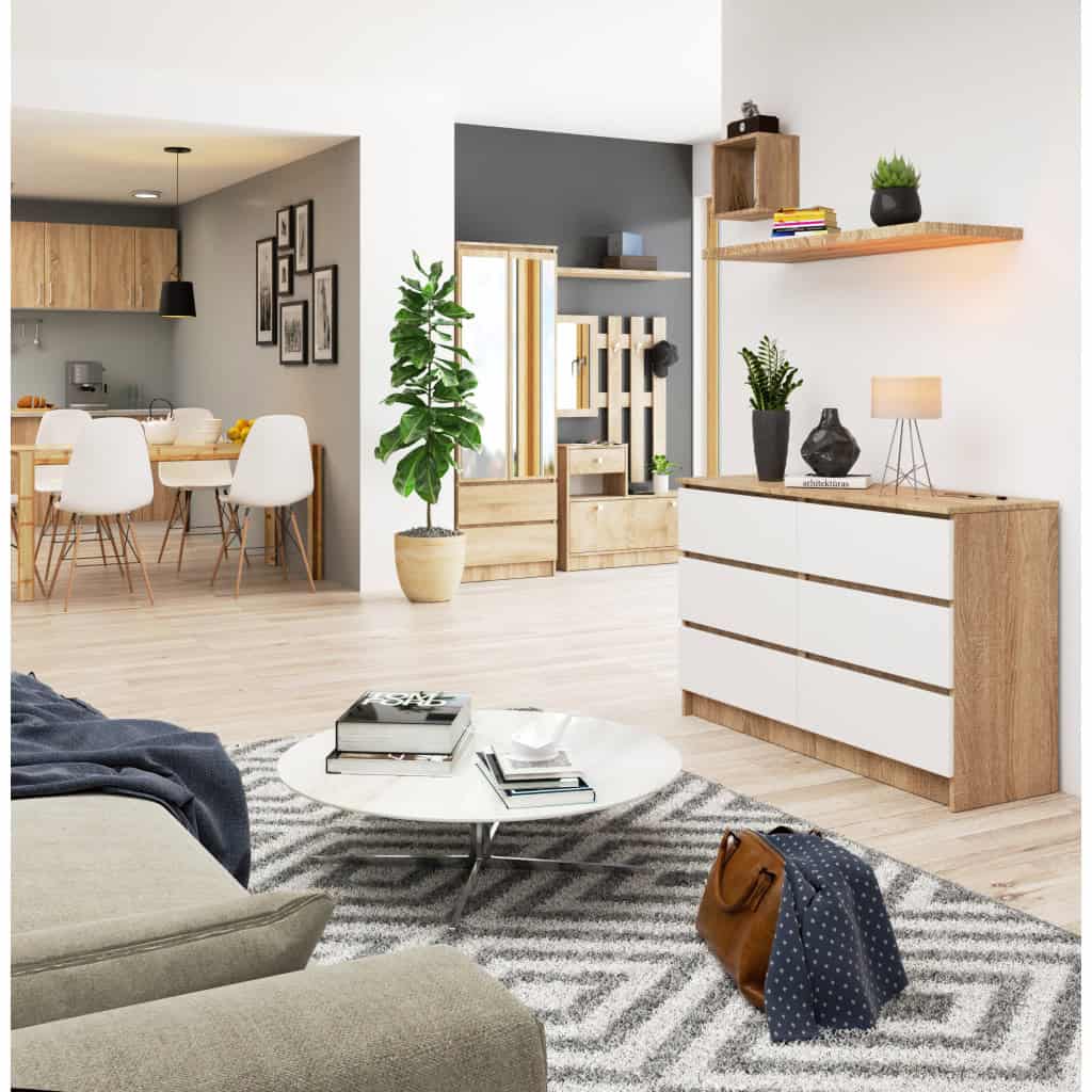 Comoda cu 6 sertare, PAL laminat, 120x40x77 cm, stejar sonoma si alb mat Mob360 – produs disponibil în magazinul Mob360.