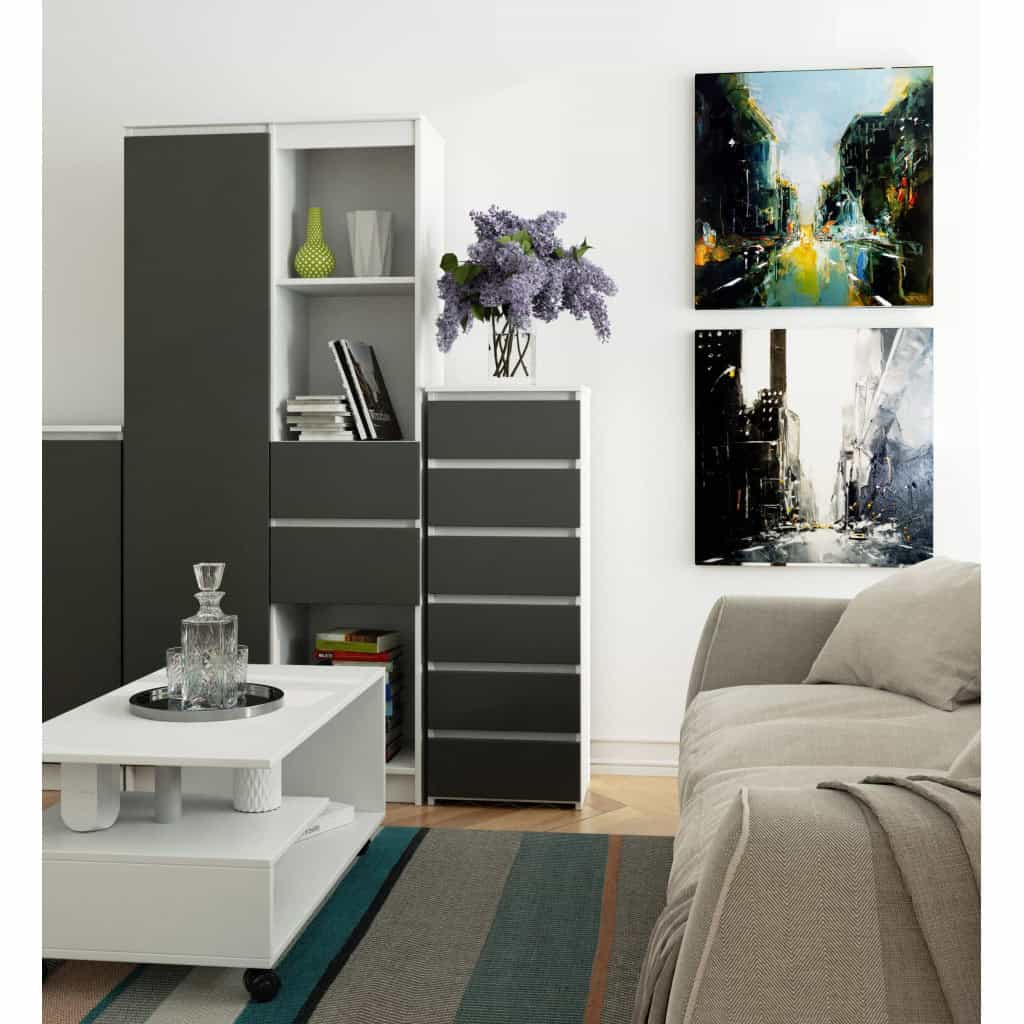 Comoda cu 6 sertare, PAL laminat 16 mm, 40x35x109 cm, alb si gri Mob360