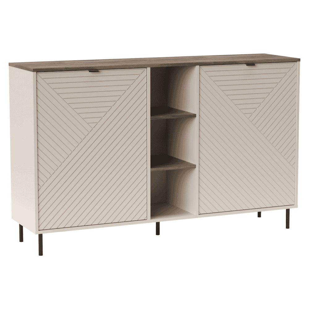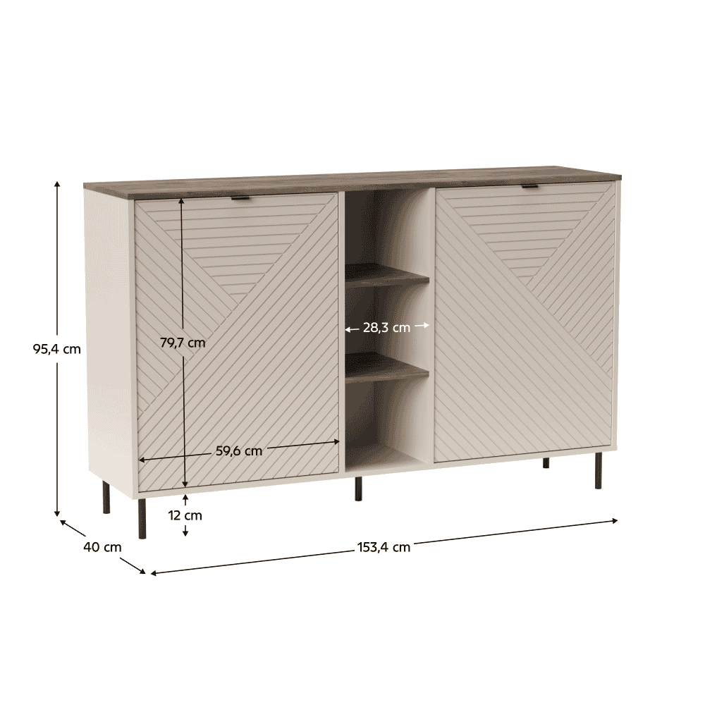 Material: DTD laminat/MDF înfoliat/margini ABS Culoare: caşmir/stejar castello Dimensiuni (Lxlxh): 153,4x40x95,4 cm Grosimea materialului: 1,6 cm Cu două uşi Două dulăpioare Dimensiuni dulăpior (Lxh): 59,6×79,7 cm Spaţiu de depozitare deschis Poliţe Cu prindere Cu mânere Materialul mânerelor: metal Culoare mânere: neagră Pe picioare Materialul picioarelor: metal Culoarea picioarelor: neagră Înălţimea picioarelor: 12 cm Portanţă placă superioară: 10 kg Portanţa poliţă: 5 kg Uşi decorative Design modern Vă recomandăm să-l fixaţi de perete Livrat dezasamblat
