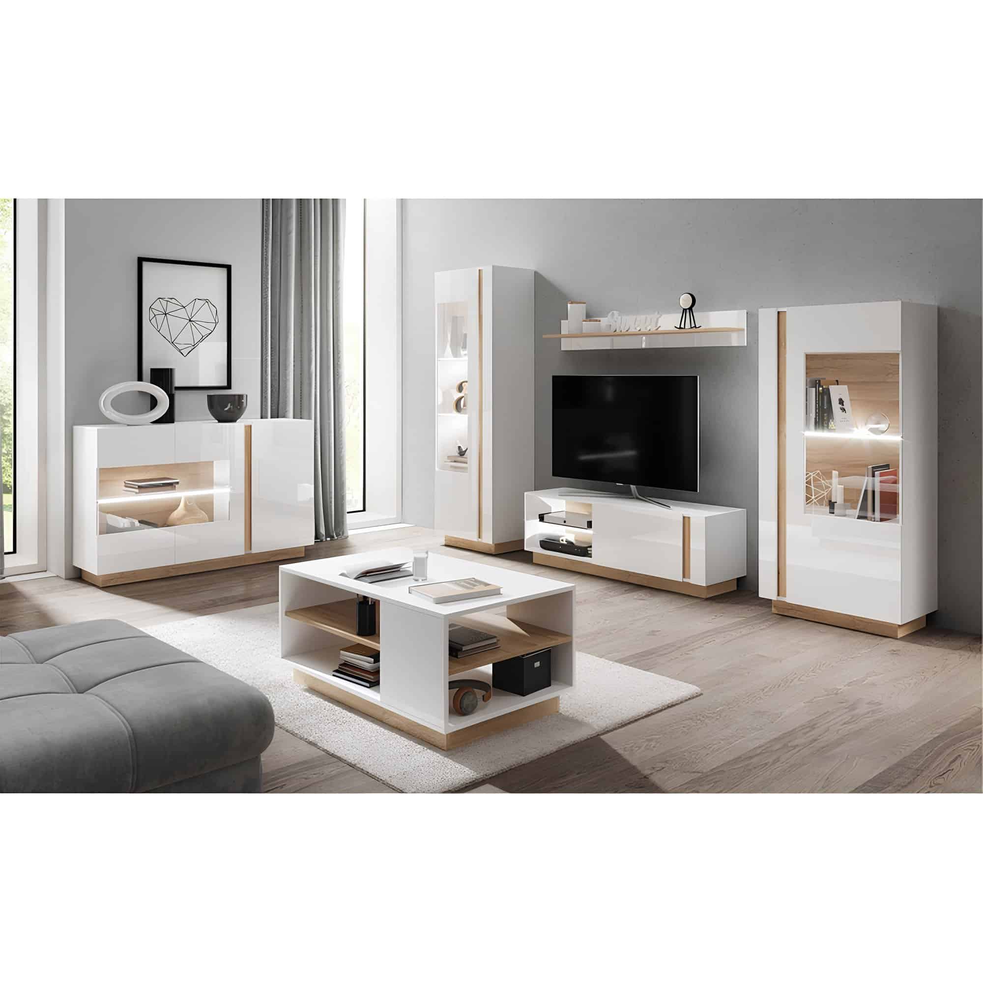 Comodă cu sticlă, alb/stejar grandson/alb lucios, CITY
