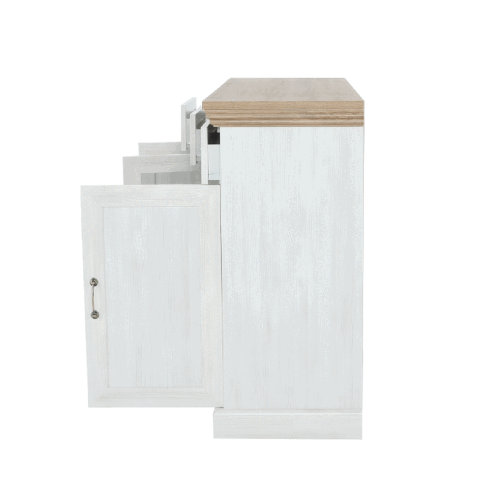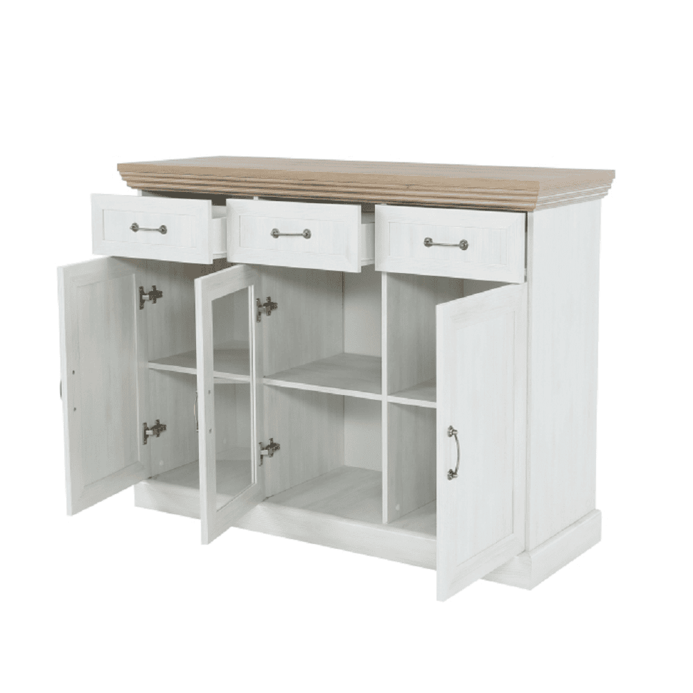 Comodă K1S, cu trei uşi, cu trei sertare, din ansamblul modular elegant Royal în stilul provensal.