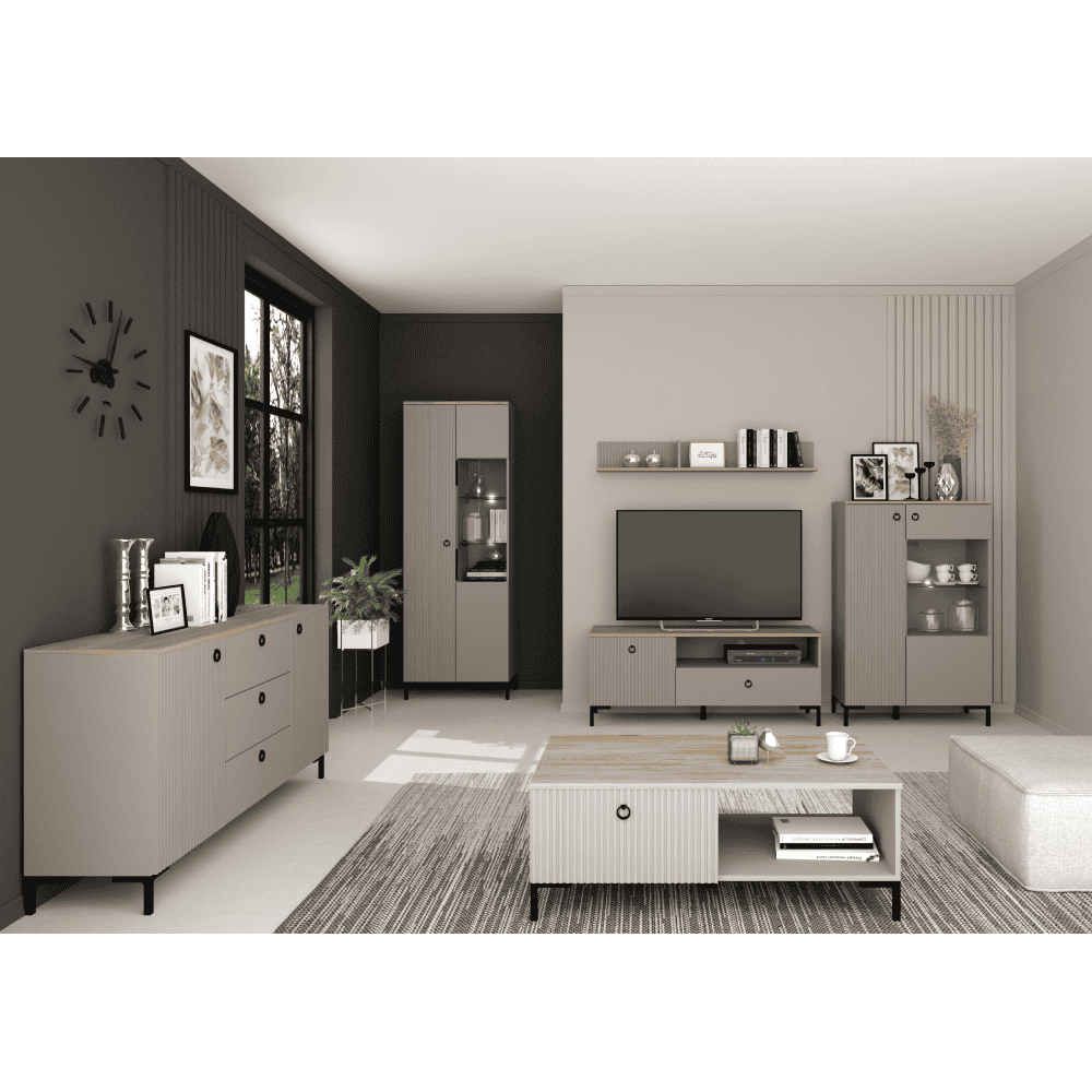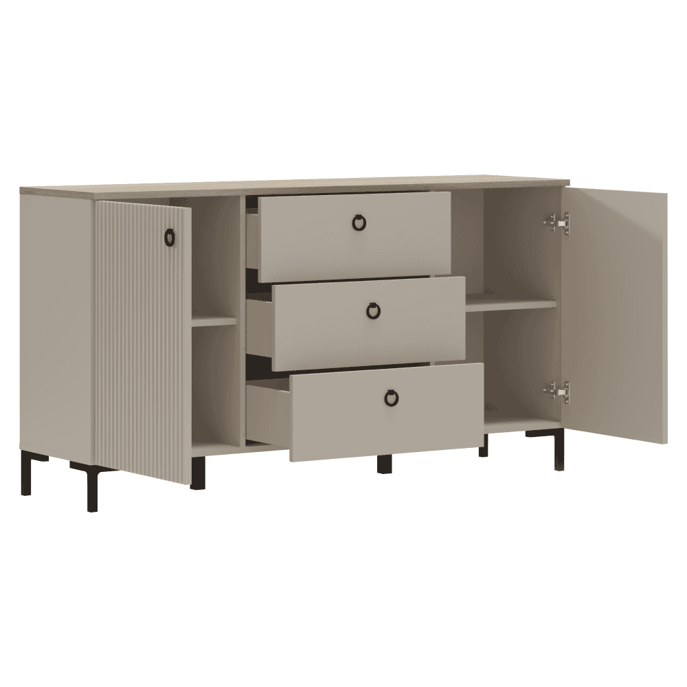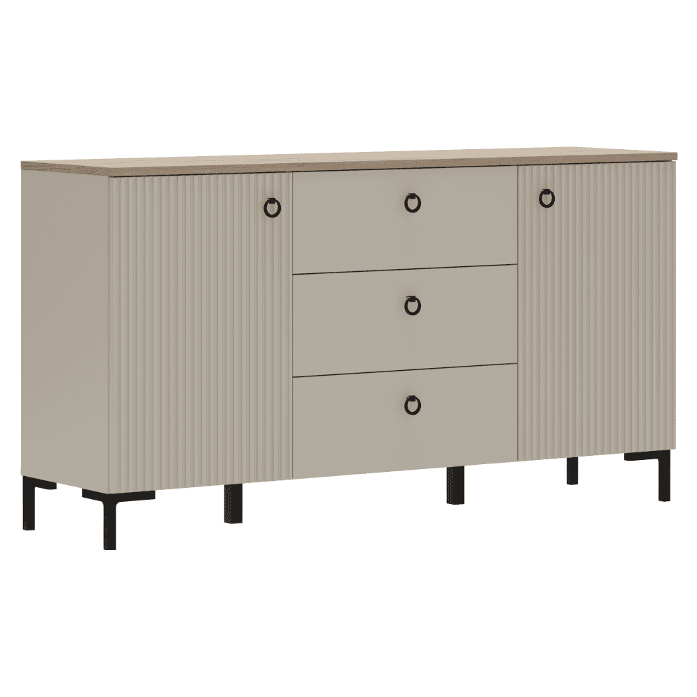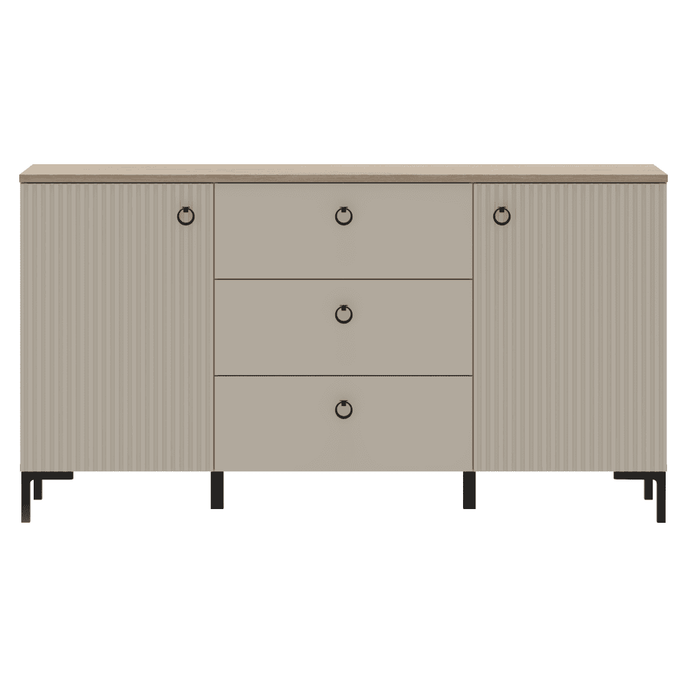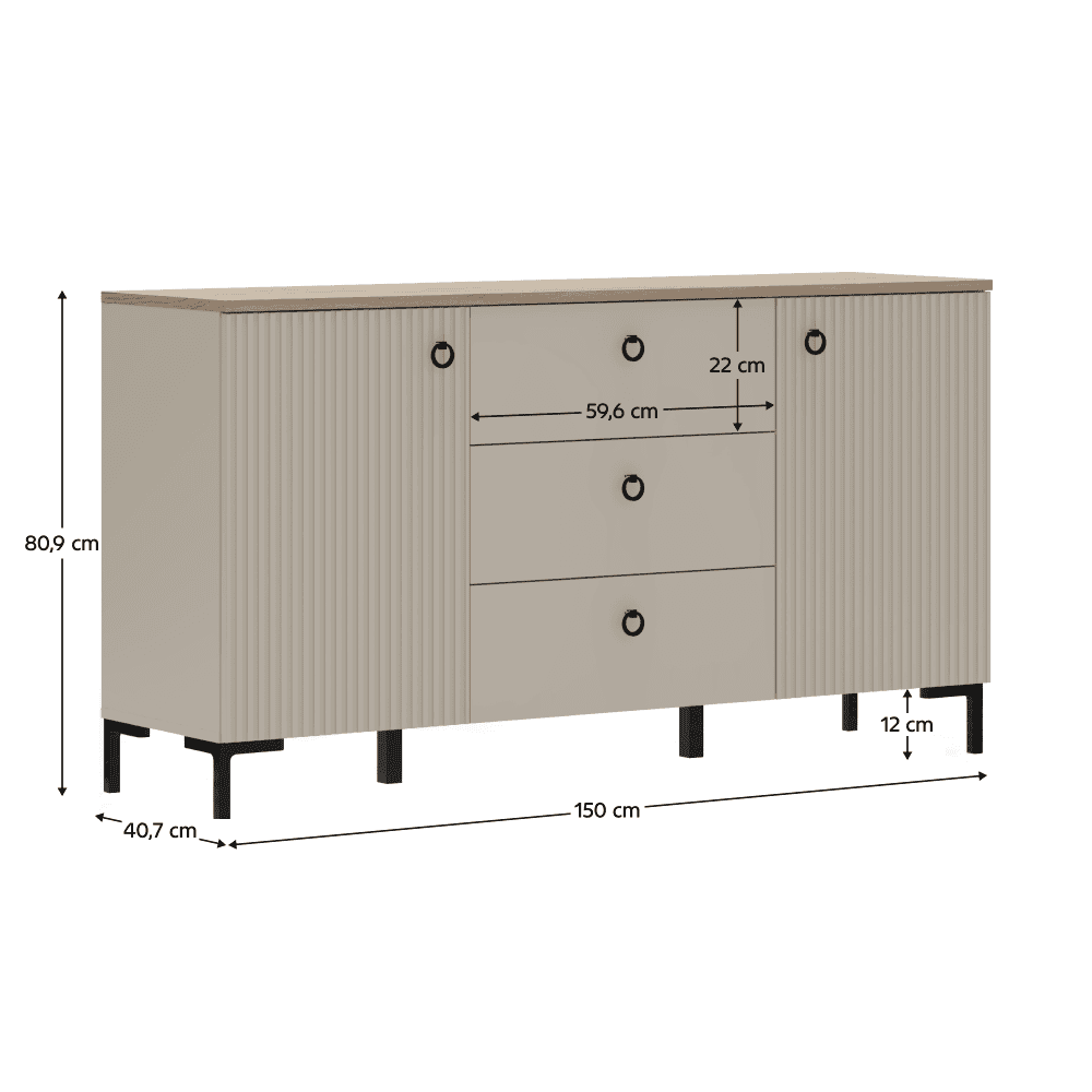 Material: MDF laminat DTD/înfoliat Culoare: gri-maroniu Taupe/stejar silverjack Dimensiuni (lxAxh): 150×40,7×80,9 cm Grosimea materialului DTD: 1,6-1,8 cm Grosimea materialului MDF: 1,9 cm Cu două uşi, Cu poliţe Trei sertare, Dimensiuni sertar (lxh): 59,6×22 cm Portanţa blatului superior: 10 kg Portanţa poliţei: 5 kg Portanţă sertar: 3 kg Cu mânere Material mâner: metal Culoare mâner: negru mat Pe picioare Înălţimea picioarelor: 12 cm Material picior: plastic Culoare picior: negru mat Uşi decorative frezate Design modern Recomandăm fixarea pe perete Livrat dezasamblat
