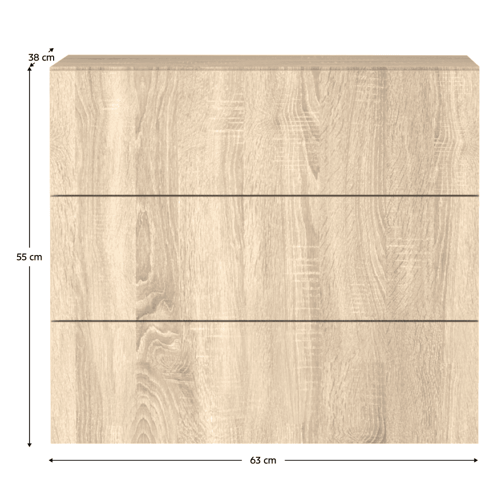 Material: DTD laminat Culoare: stejar sonoma Dimensiuni (lxAxh): 63x38x55 cm Grosimea materialului DTD: 1,6-2,2 cm Portanţa plăcii superioare: 10 kg Trei sertare Portanţă sertar: 3 kg Rulment cu bile extensibil complet Margine: hârtie impregnată cu polimeri termoreactivi Grosime DTD partea din spate/fund sertar: 0,3 cm Culoarea părţii din spate/fund sertar: stejar sonoma Fără mânere Sistem de deschidere tactilă PUSH UP Design modern Recomandăm fixarea de perete Livrat dezasamblat