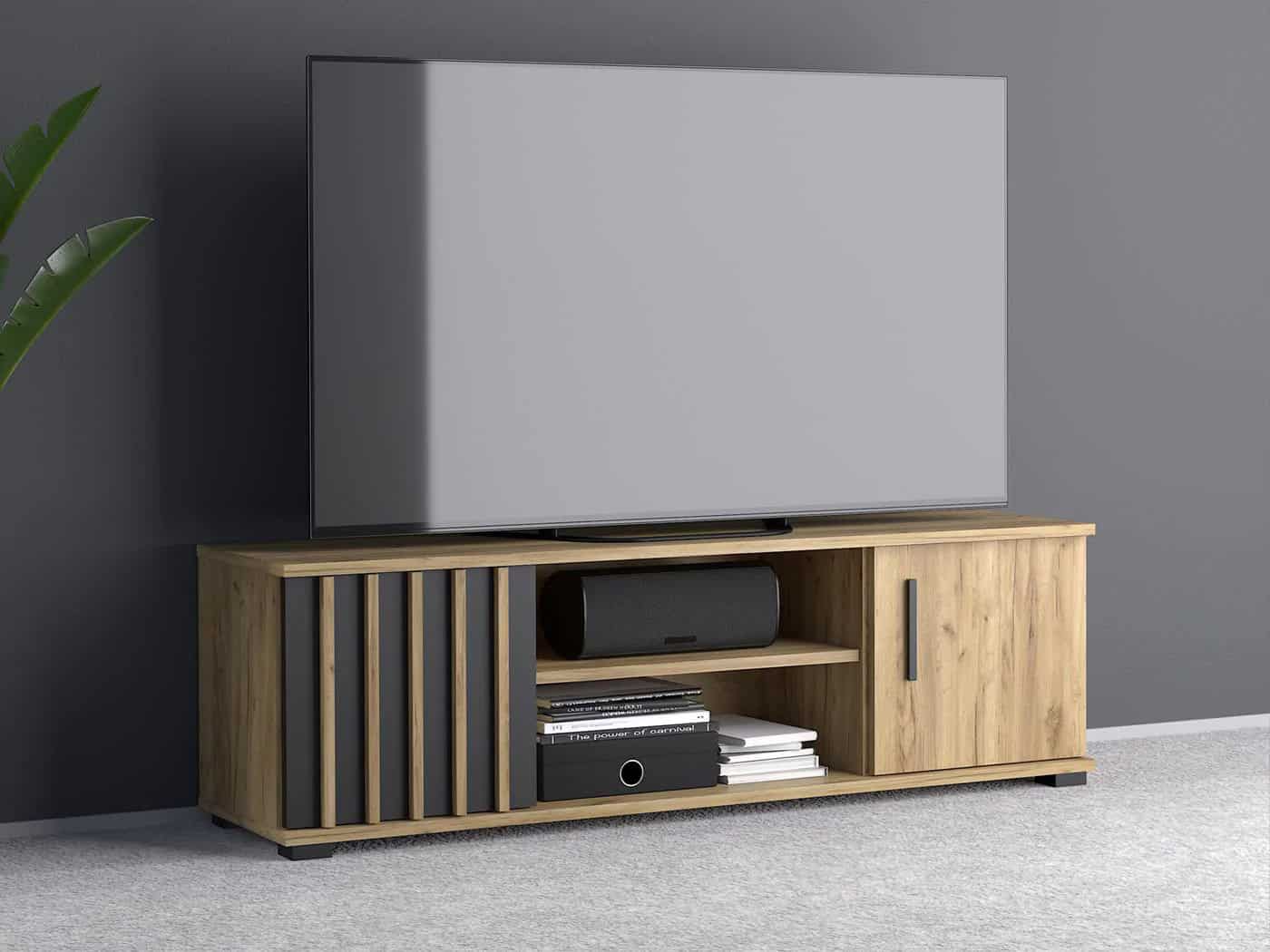 Comoda TV moderna 140×37 cm cu 2 usi si rafturi, finisaj craft cu negru Mob360