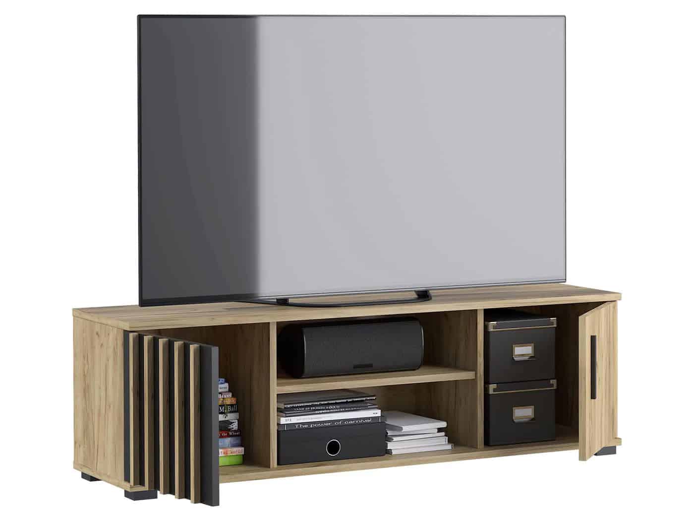 Comoda TV moderna 140×37 cm cu 2 usi si rafturi, finisaj craft cu negru Mob360 – produs disponibil în magazinul Mob360.