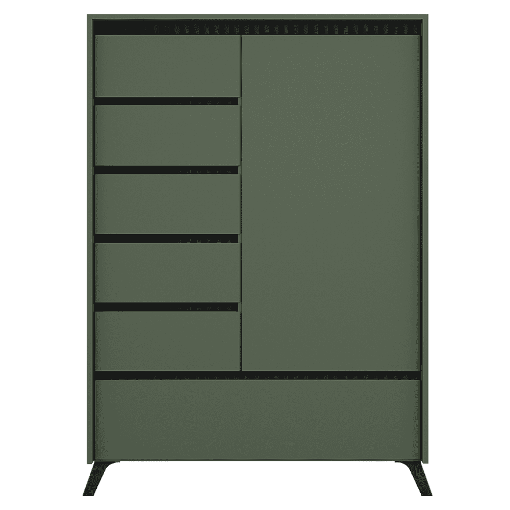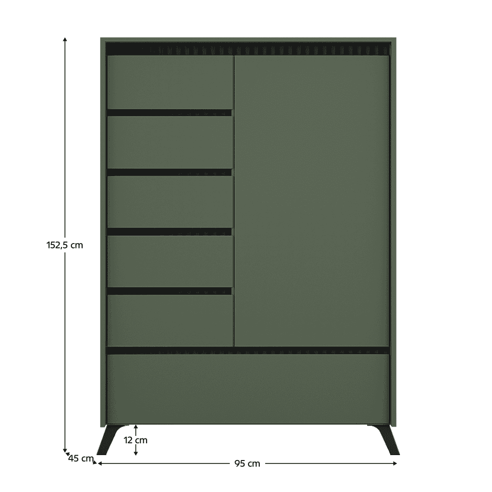 Material: DTD laminat/MDF înfoliat/folia PVC Culoare: verde smoke/negru Dimensiuni (lxAxh): 95x45x152,5 cm Grosimea materialului: 1,6-1,9 cm Cu o uşă Dulap basculant Cinci sertare Poliţe Pe picioare Culoare picior: negru Înălţimea piciorului: 12 cm Rulmenţi cu bile extensibile complet Balamale Margine: hârtie impregnată cu polimeri termoreactivi/PVC Grosimea materialului ABS: 0,5 mm Grosime placă aglomerată partea din spate/fund sertar: 0,3 cm Culoare partea din spate/fund sertar: stejar închis milano Frezare decorativă Fără mânere Design modern Livrat dezasamblat