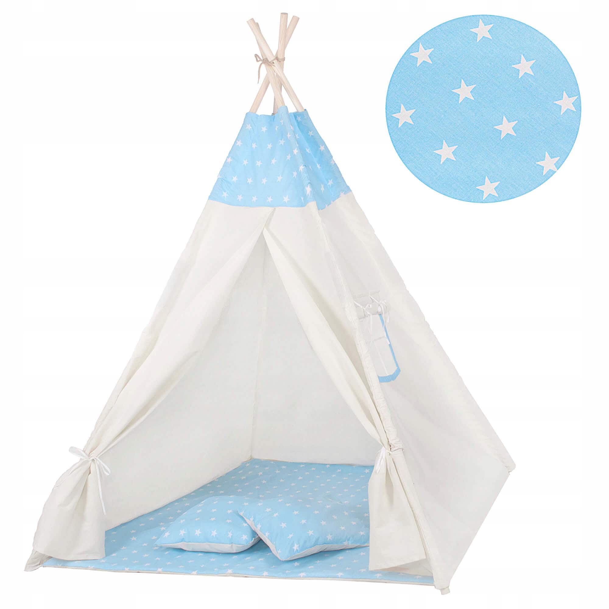 Cort copii stil indian Teepee Tent cu fereastra, covoras gros si 2 perne, alb albastru Mob360 – produs disponibil în magazinul Mob360.