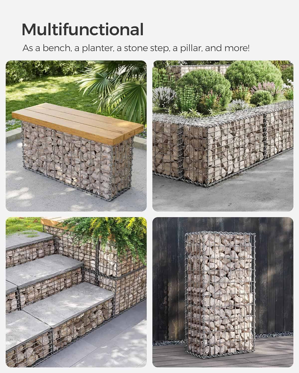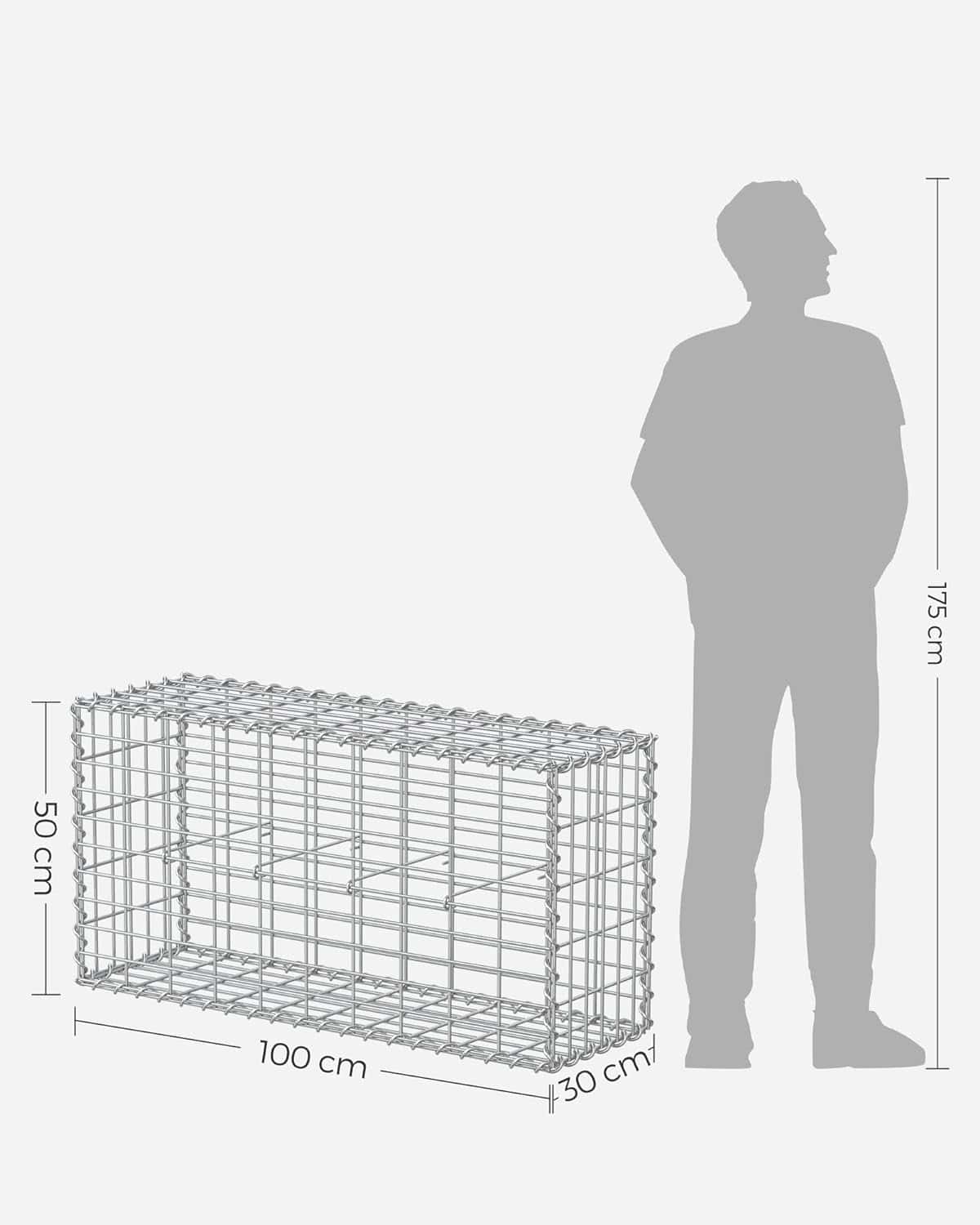 sau de dispunerea spatiului, puteti folosi gabionul singur sau puteti combina mai multe impreuna pentru a le folosi ca un ghiveci, o banca, o treapta de piatra sau un stalp in gradina dvs.Un cos de gabioane de 100 x 50 x 30 cm care poate oferi gradinii dvs.