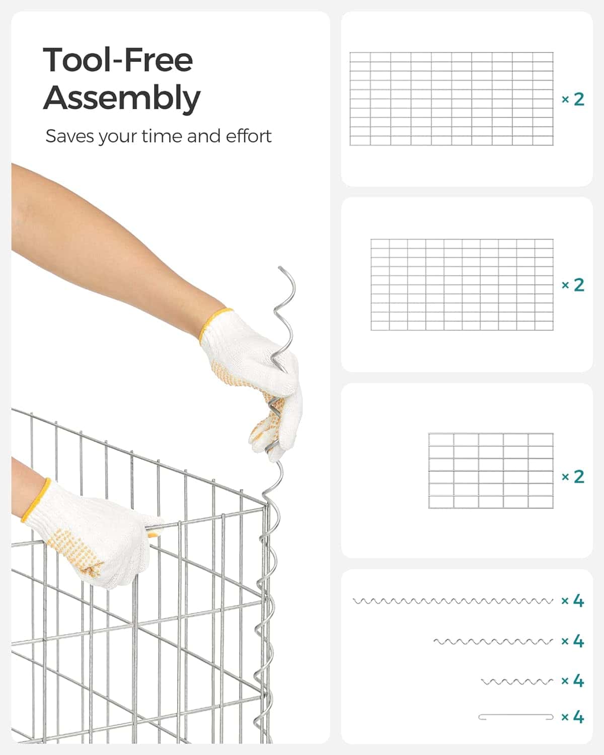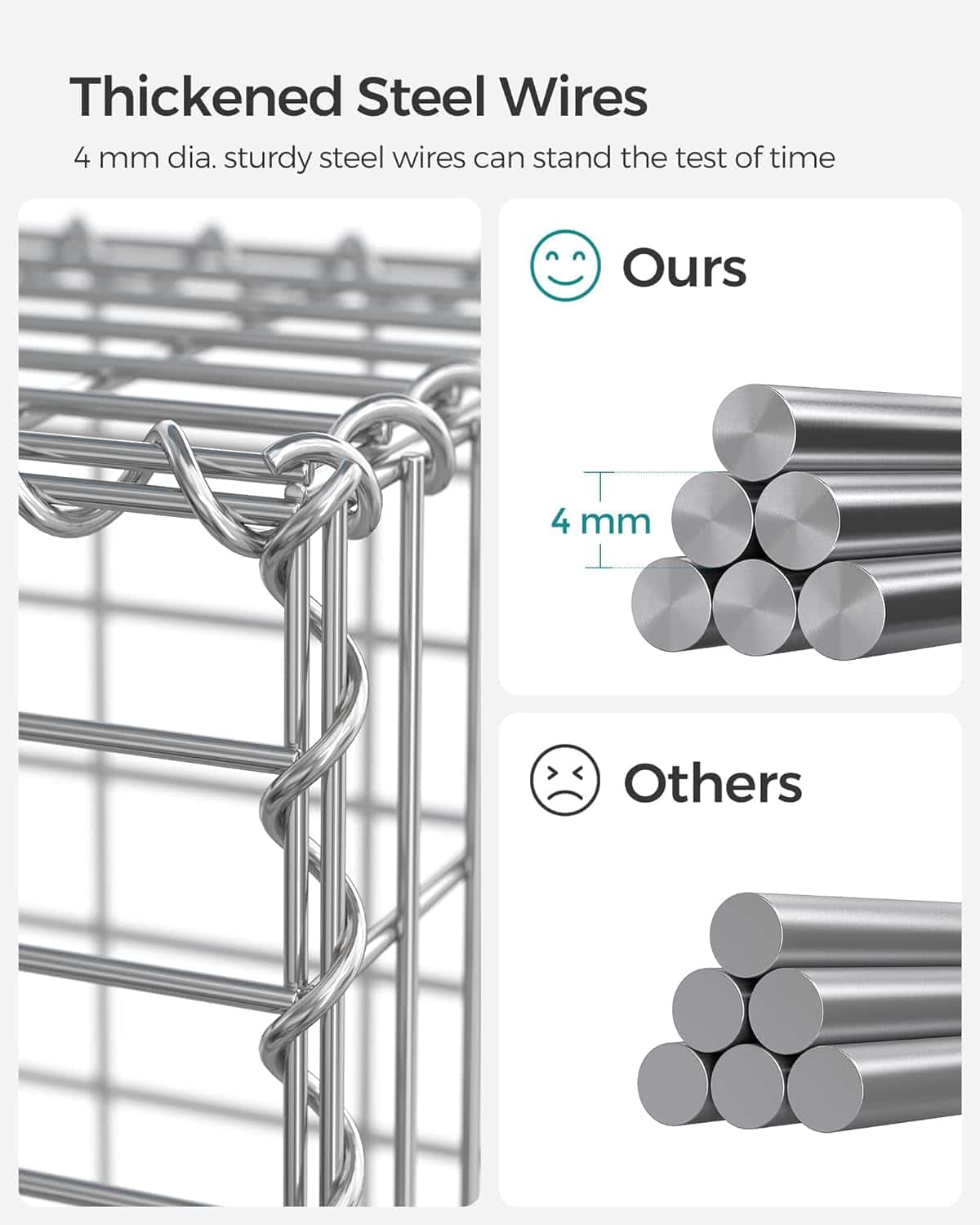 Realizat din otel galvanizat cu diametrul de 4 mm, acest cos gabion este solid, rezistent la rugina si coroziune pentru a va impodobi gradina sezon dupa sezon.Nu este nevoie de scule pentru a asambla aceasta cusca de gabioane metalice! Pur si simplu aliniati grilele adiacente si rasuciti tijele in spirala pentru a le lega impreuna, apoi cosul gabion este gata de utilizare.
