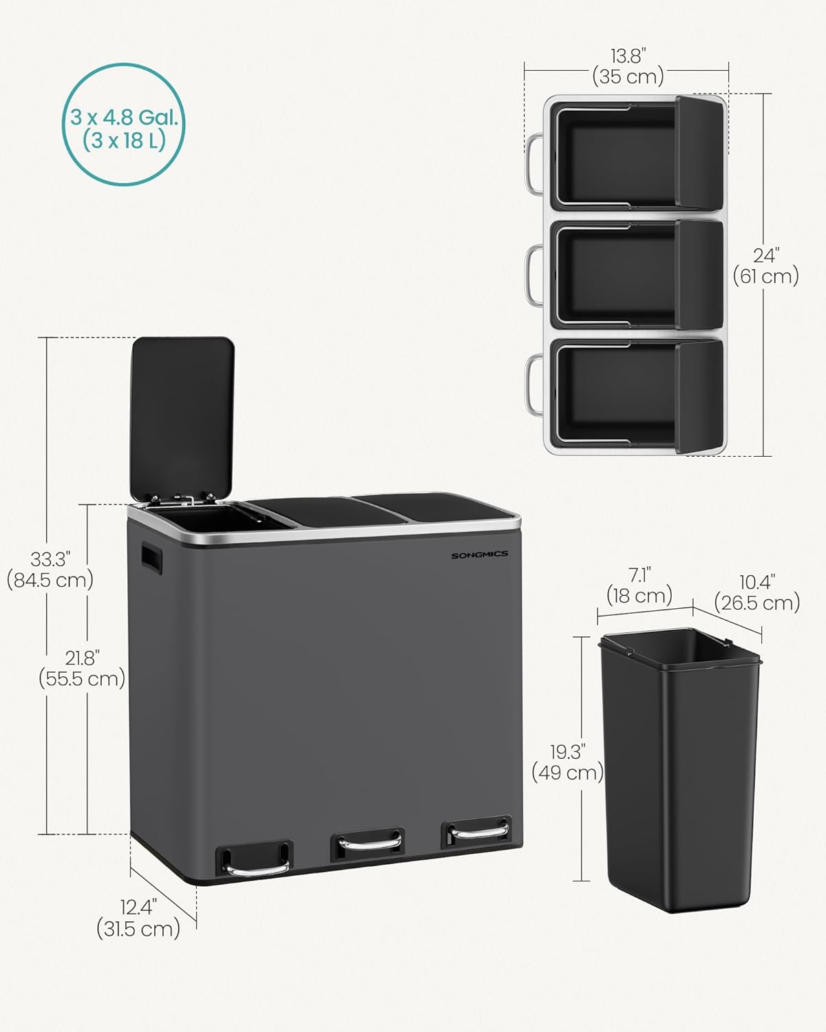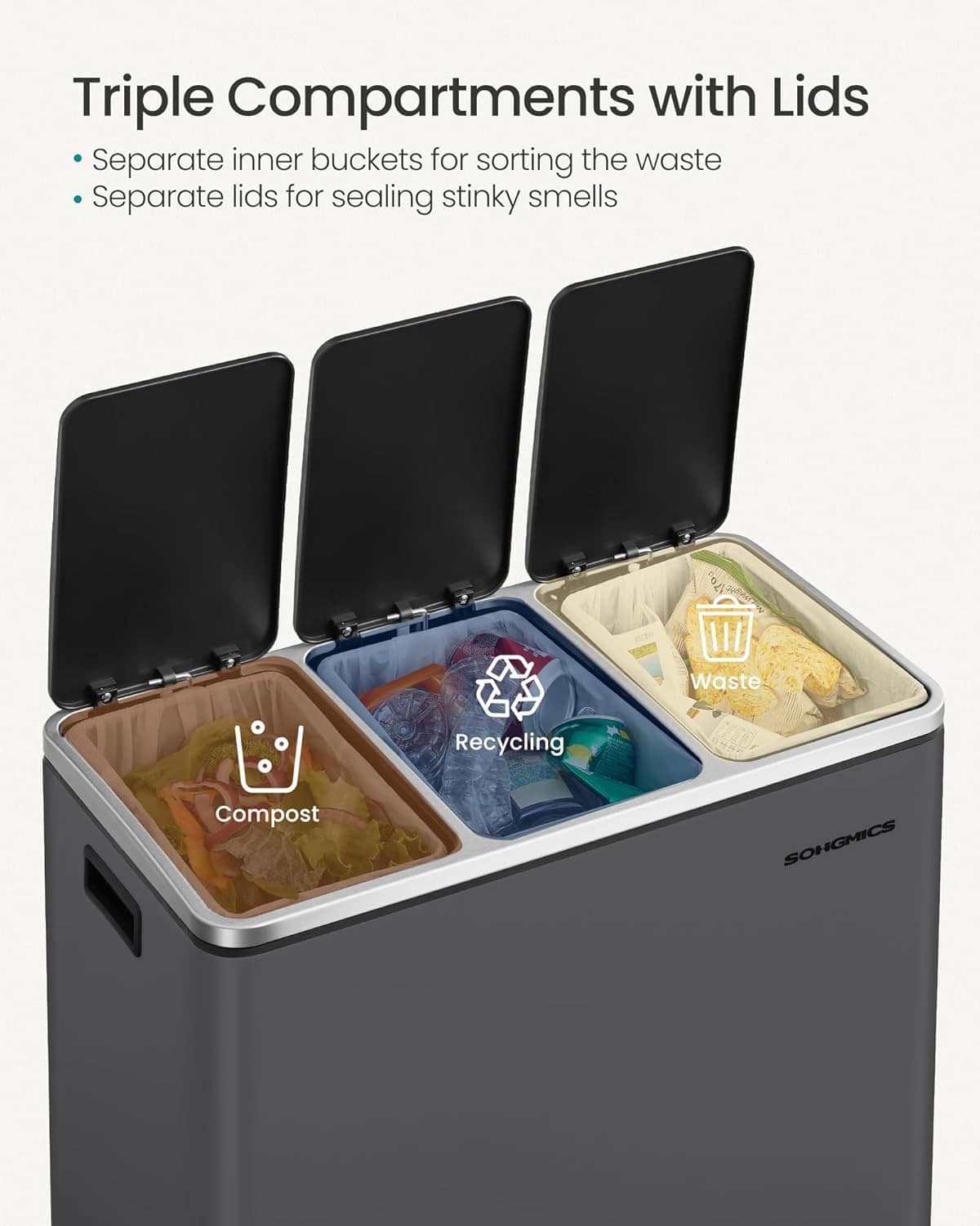 - Simplifica procesul de reciclare cu acest cos de gunoi cu 3 compartimente separate. Designul modern si sistemul cu pedale ofera igiena si eficienta, fiind ideal pentru orice bucatarie organizata. Caracteristici principale: 3 compartimente separate pentru sortarea deseurilor