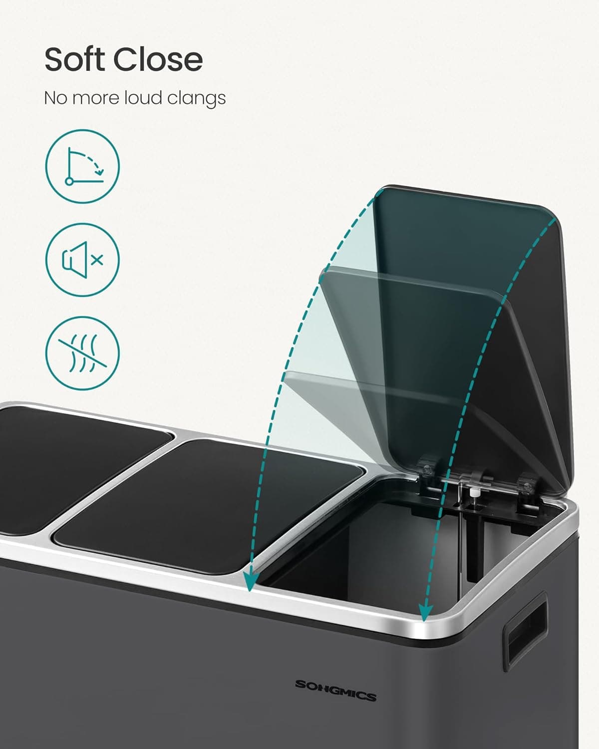 Cos de gunoi colectare selectiva cu 3 compartimente 3 x 18L, capace soft close, pedale, otel, 61x32x56 cm, gri mat Mob360