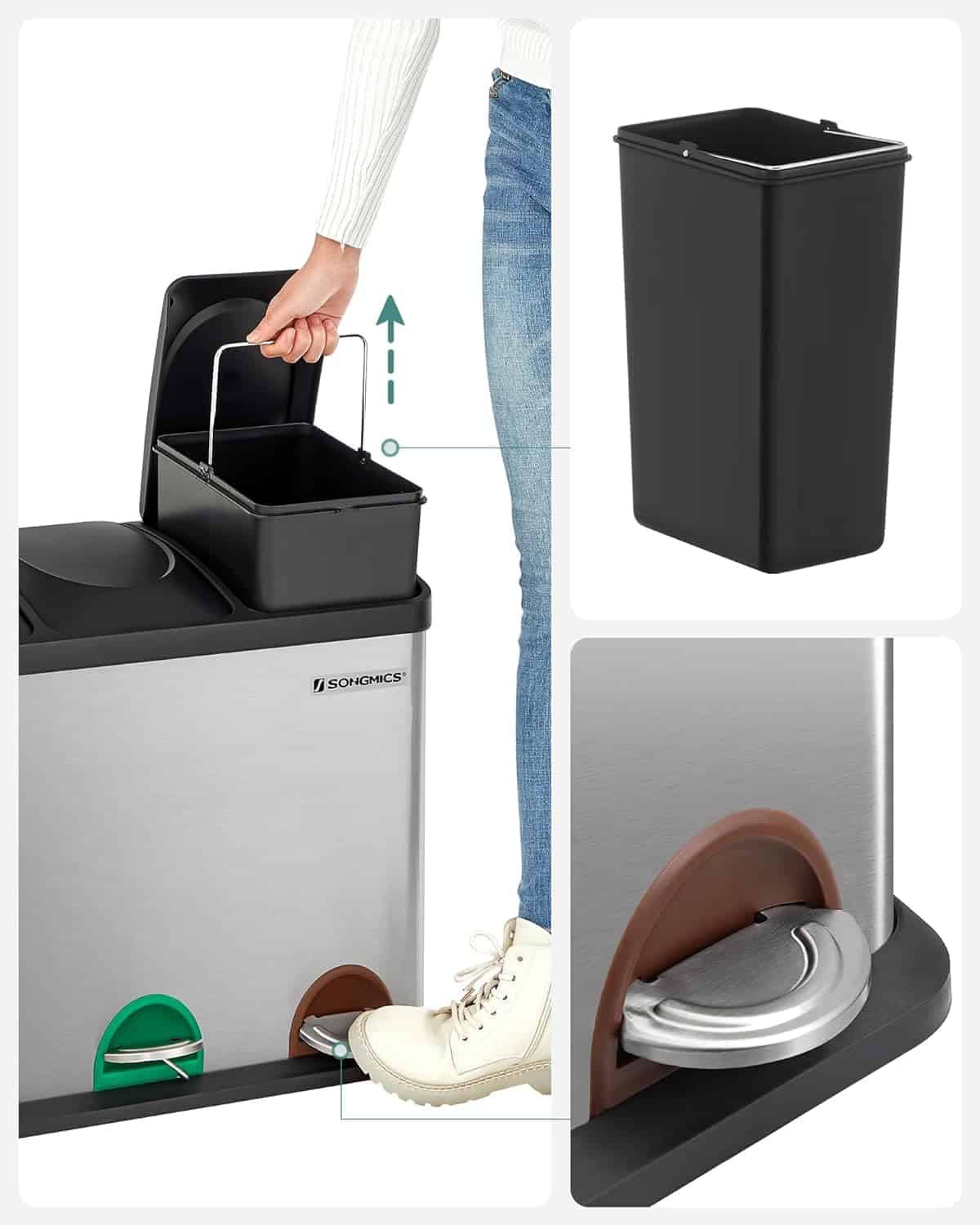 Simplitate de sortare : Avand 3 pubele de 15 litri, puteti separa fara efort gunoiul de reciclare, facand sortarea cu aceasta pubela mai convenabila, dezvoltand in acelasi timp obiceiuri pozitive. Remarcabil in detaliu: Capacele ermetice pastreaza mirosurile in interior; cele 3 pedale elegante cu un design elaborat nu sunt doar usor de calcat, ci si placute la vedere, ceea ce duce la un obicei de sortare a deseurilor in intreaga familie. Sortare in functie de culoare: Oferind o sansa minunata de a va invata copiii sa recicleze si o curatenie redusa pentru adulti, aceasta pubela cu pedale cu 3 pedale cu coduri de culoare ajuta la sortarea diferitelor tipuri de reciclare fara complicatii si la identificarea rapida a compartimentelor. O promisiune simpla: Punga de captuseala a alunecat si s-a rupt si a creat din greseala o balta de grasime in galeata? Nu va faceti griji, fiecare compartiment vine cu o galeata interioara detasabila cu manere, ceea ce inseamna ca va fi golirea si curatarea nu va fi atat de dificila. Ce primiti: O pubela de gunoi de 45L cu 3 sectiuni, 3 pedale si galeti interioare detasabile pentru o eliminare usoara a deseurilor si o reciclare fara probleme.