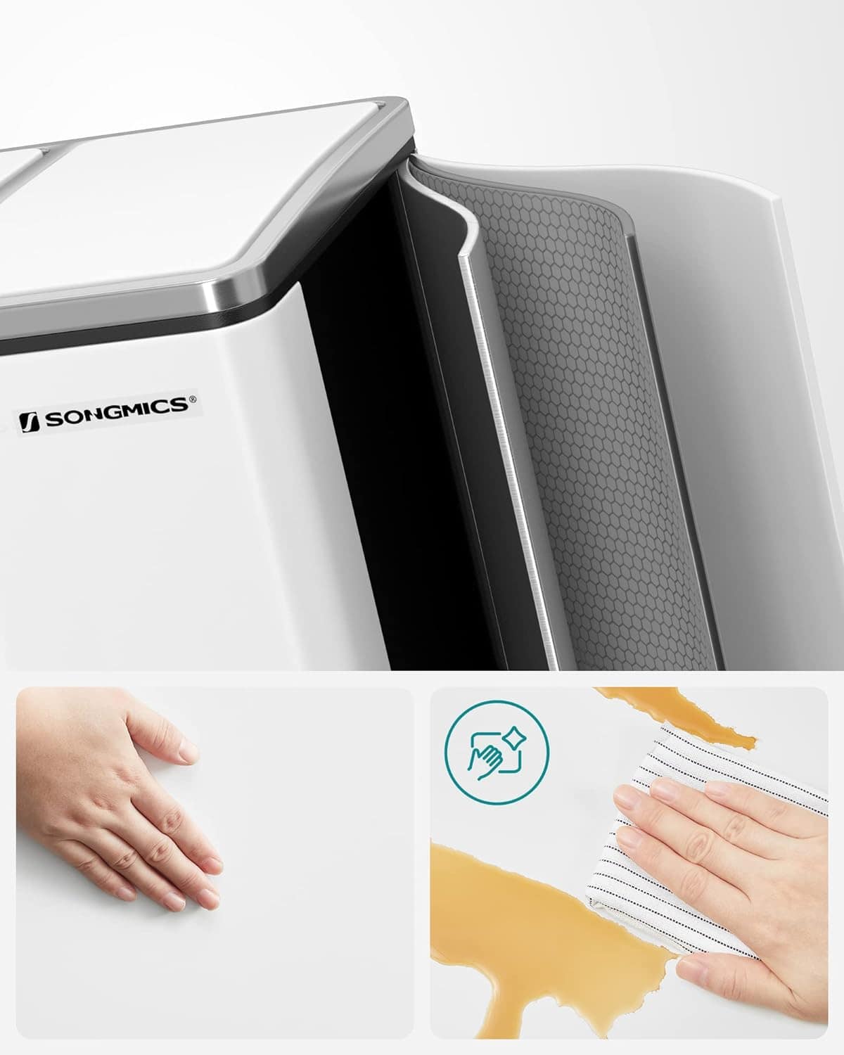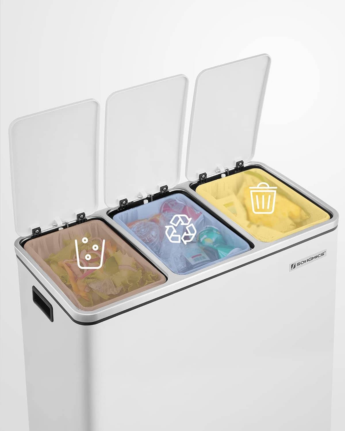 Specificatii: Culoare: alb Material: Otel, galeata interioara din plastic PP, capac din plastic ABS Dimensiunea totala a produsului: 61,5 x 31,5 x 56 cm (L x l x a) Dimensiunea fiecarei galeti interioare: 18 x 26,5 x 49 cm (L x l x i) Inaltimea totala cu capacul deschis: 84,5 cm Greutatea produsului: 9,1 kg Despre acest articol Cu acest cos de gunoi cu trei compartimente de 18 litri, puteti depozita gunoiul, de exemplu, deseuri de ambalaje, deseuri organice si deseuri reziduale.Cosul de gunoi pentru bucatarie este fabricat din otel si este rezistent la rugina. Pur si simplu stergeti suprafata cosului de gunoi cu o carpa umeda.Capacele cosului se inchid incet, silentios si delicat pentru a preveni zgomotul neplacut.Linii clare, culoare neagra eleganta – Acest sistem de separare a deseurilor are un aspect modern si se potriveste perfect cu alte obiecte de mobilier si aparate de uz casnic.Usor de deschis si golit: Pur si simplu apasati pe pedala pentru a deschide capacul acestui cos de gunoi fara a atinge cosul cu mana. Galetile interioare pot fi ridicate si golite cu usurinta datorita manerului metalic.