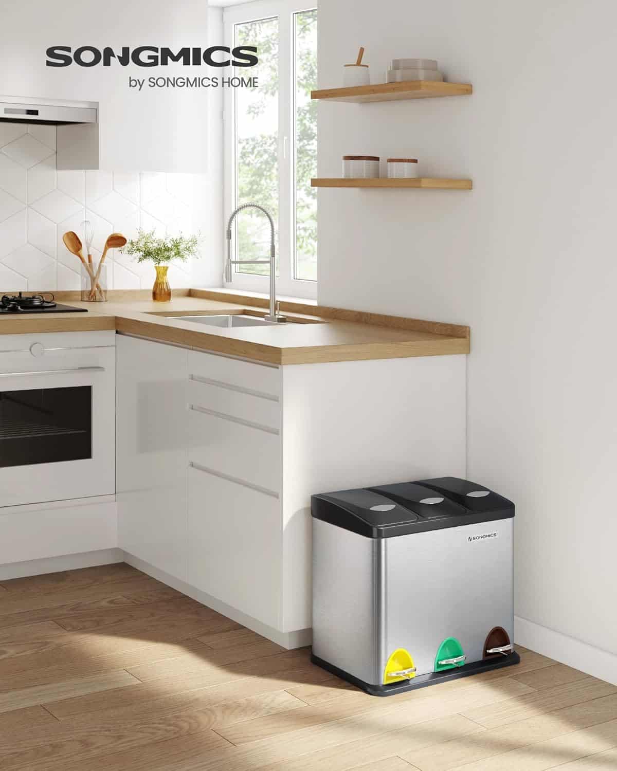 Material: otel inoxidabil (carcasa); plastic (cutia interioara) Dimensiuni interior cos: 23 x 35 x 14 cm (lxhxl) Dimensiuni exterioare 46 x 24.5 x 39.5 cm; 4.2 kg Separator de gunoi ideal – Material: Carcasa din otel inoxidabil; Galeata interioara din plastic. Rezistent la zgarieturi si rugina. Cu acest separator de gunoi (24 L) sortarea gunoiului este o joaca de copii. O sortare tripla este foarte practica cu cele trei insertii (fiecare 8 L). Otelul inoxidabil de inalta calitate garanteaza o durata lunga de viata si contribuie la un aspect elegant. Mecanism silentios al pedalei pentru deschidere: Deschidere usoara si confortabila datorita mecanismului pedalei. Mecanismul piciorului este foarte confortabil si nu necesita forta bruta in picioare. Pedalele sunt colorate izbitor. Pedalele anti-alunecare faciliteaza deschiderea. In utilizarea de zi cu zi, se dovedeste a fi foarte stabil si silentios. Impartire practica in 3 containere interioare: 3 pubele interioare robuste din plastic negru de inalta calitate (PE-polietilena). Cele trei pubele detasabile sunt perfect adecvate pentru separarea deseurilor si, datorita manerelor cromate, asigura o golire rapida si necomplicata. Design perfect: Capacul se deschide si se inchide silentios cu pedala. Capacul relativ etans care pastreaza mirosurile este placut. Suportul pentru picioare din plastic este antiderapant si nu va va zgaria podeaua. Datorita constructiei placii de baza, este usor de curatat si intretinut. Utilizabil pe scara larga, usor de intretinut: Se potriveste in interior, de exemplu in fiecare bucatarie sau in fiecare birou, ideal si pentru lifturi, gradini etc. Cu manerul practic de transport pe spate, transportul este usor. Cosul interior si carcasa sunt usor de curatat, pur si simplu spalati cu apa si produse de curatare de uz casnic standard pentru a asigura igiena.