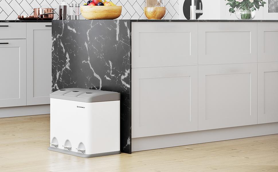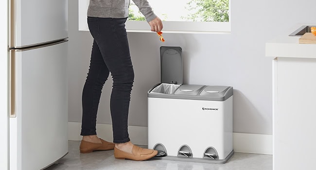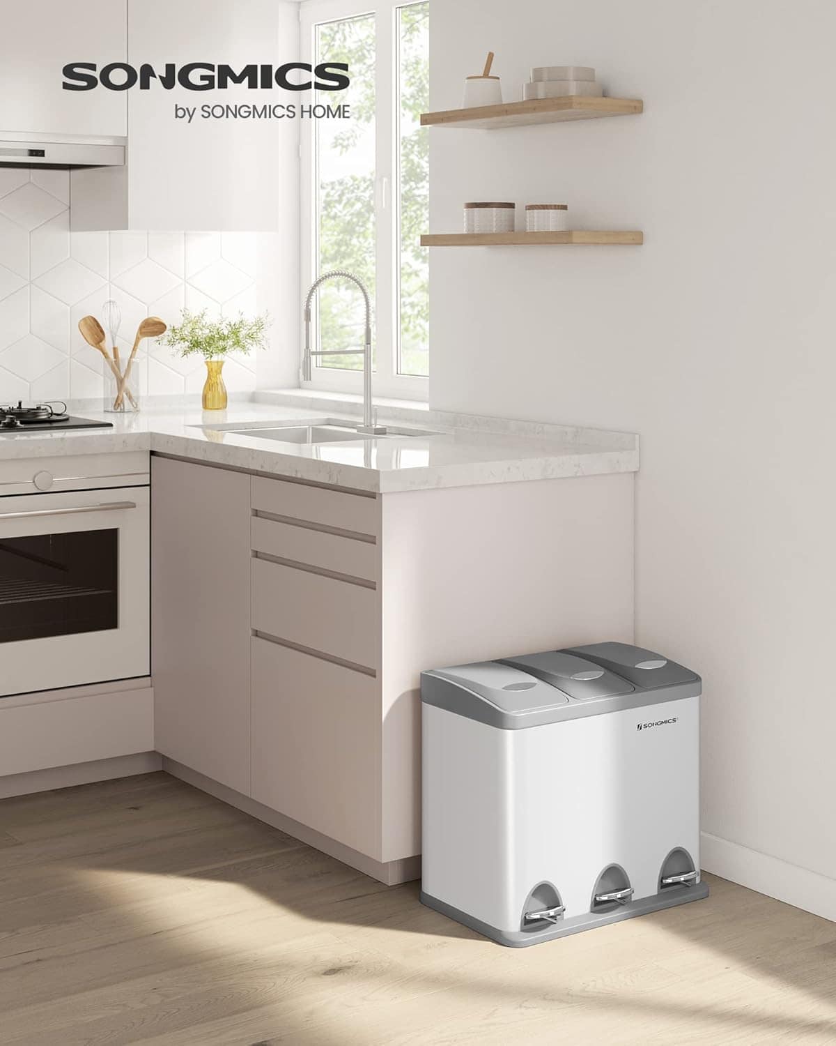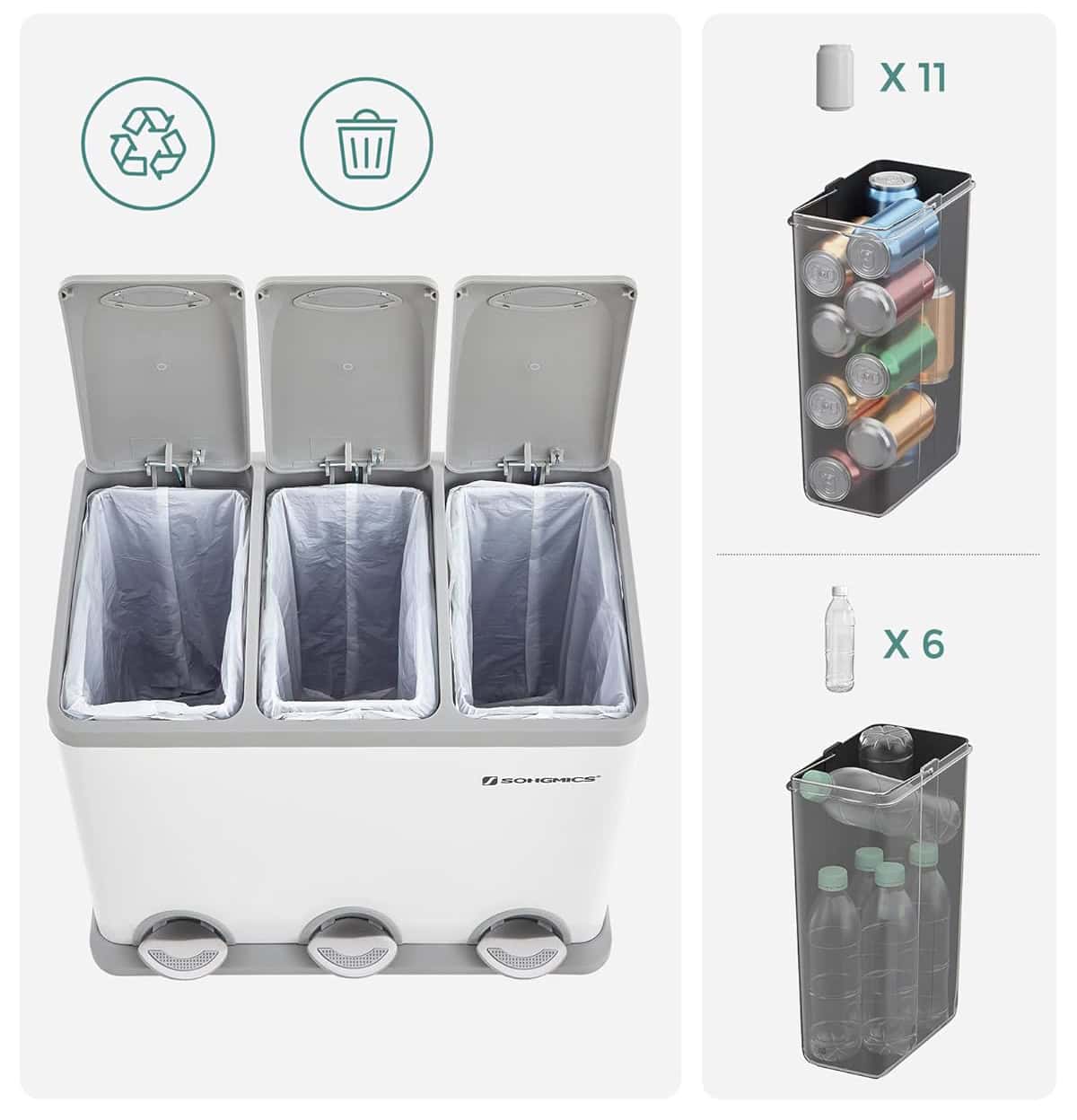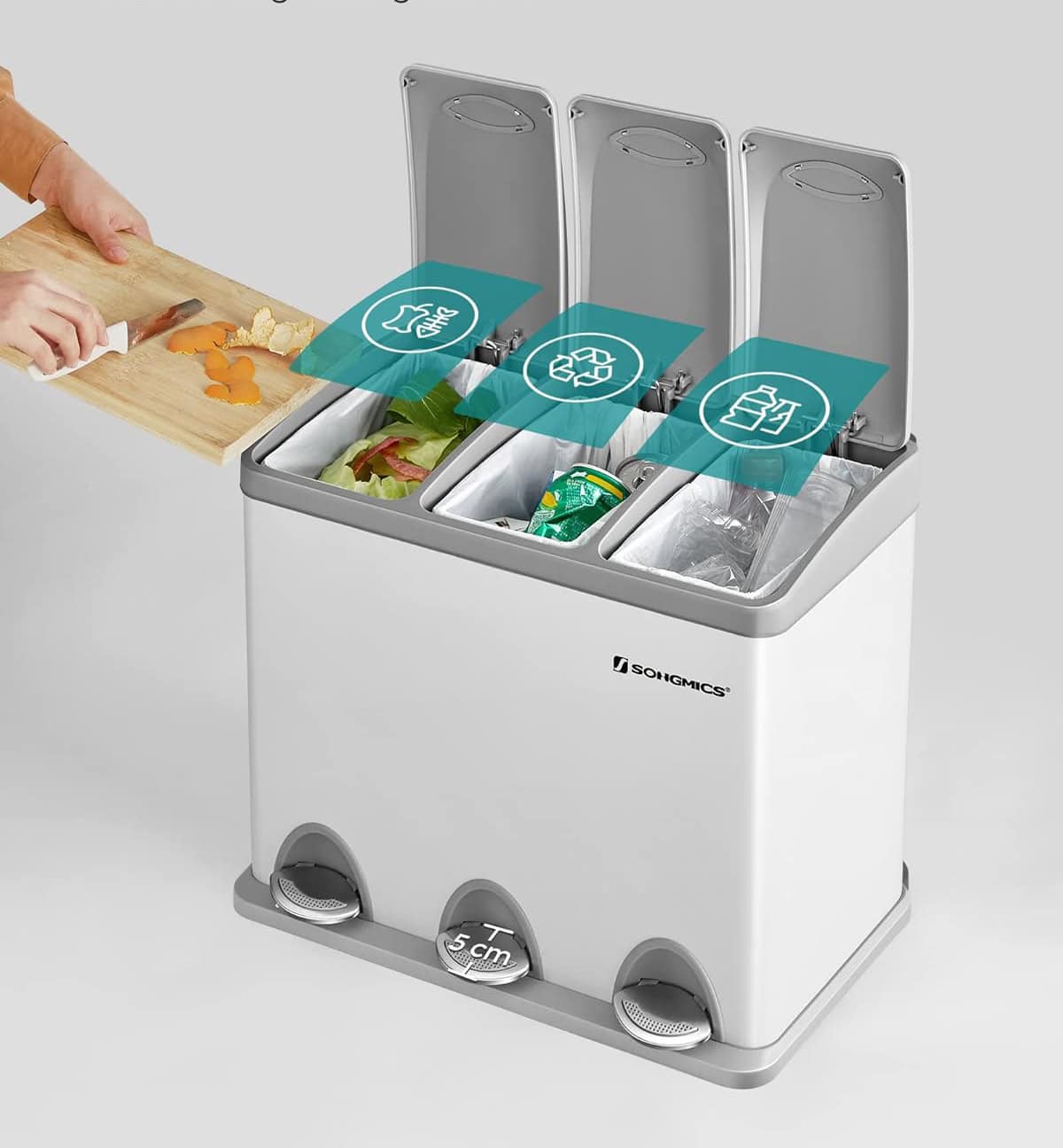 Ce primiti: Un cos de gunoi modern de 24 de litri, cu 3 compartimente, care va ajuta sa va sortati usor gunoiul.