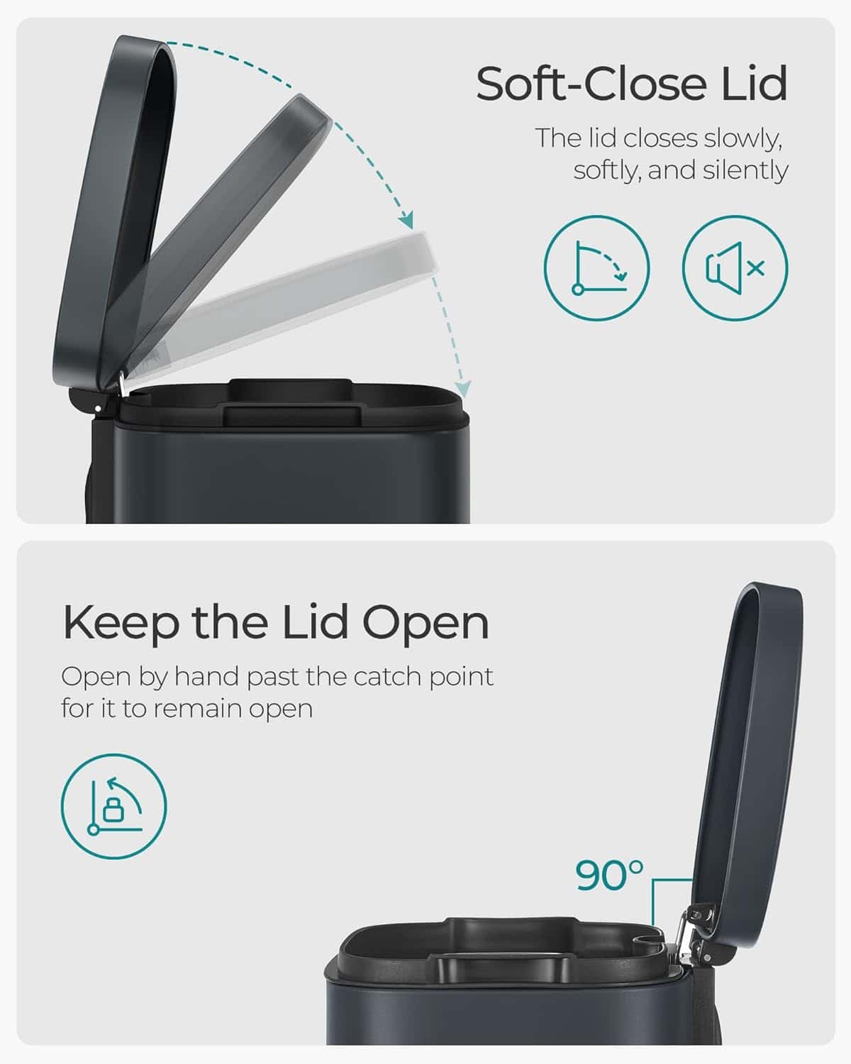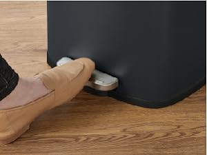 Sigiliul capacului rezistent la scurgeri si impiedica raspandirea mirosurilor.Capacul acestui cos de gunoi de bucatarie poate fi deschis cu ajutorul pedalei sau cu mainile deasupra punctului de blocare, astfel incat sa ramana deschis.Fabricat din otel de calitate, acest cos de gunoi modern este rezistent la rugina pentru o utilizare indelungata, este usor de curatat cu o carpa umeda pentru a preveni aparitia dungilor.Sacii de gunoi pot fi fixati prin plierea marginilor sacilor in orificiul din spate al galetii interioare detasabile.