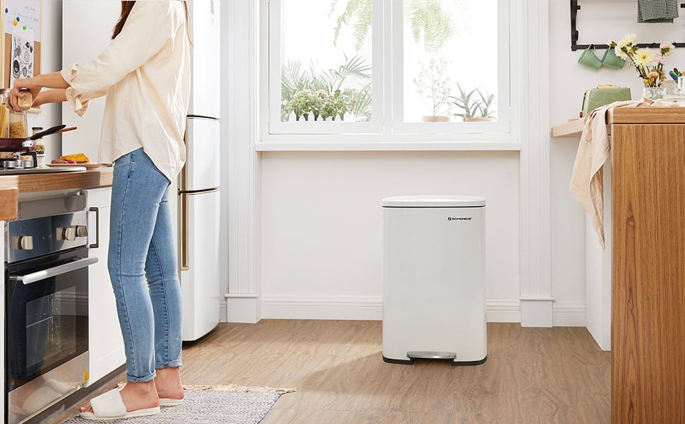 Sigiliul capacului rezistent la scurgeri si impiedica raspandirea mirosurilor.Capacul acestui cos de gunoi de bucatarie poate fi deschis cu ajutorul pedalei sau cu mainile deasupra punctului de blocare, astfel incat sa ramana deschis.Fabricat din otel de calitate, acest cos de gunoi modern este rezistent la rugina pentru o utilizare indelungata, este usor de curatat cu o carpa umeda pentru a preveni aparitia dungilor.Sacii de gunoi pot fi fixati prin plierea marginilor sacilor in orificiul din spate al galetii interioare detasabile.