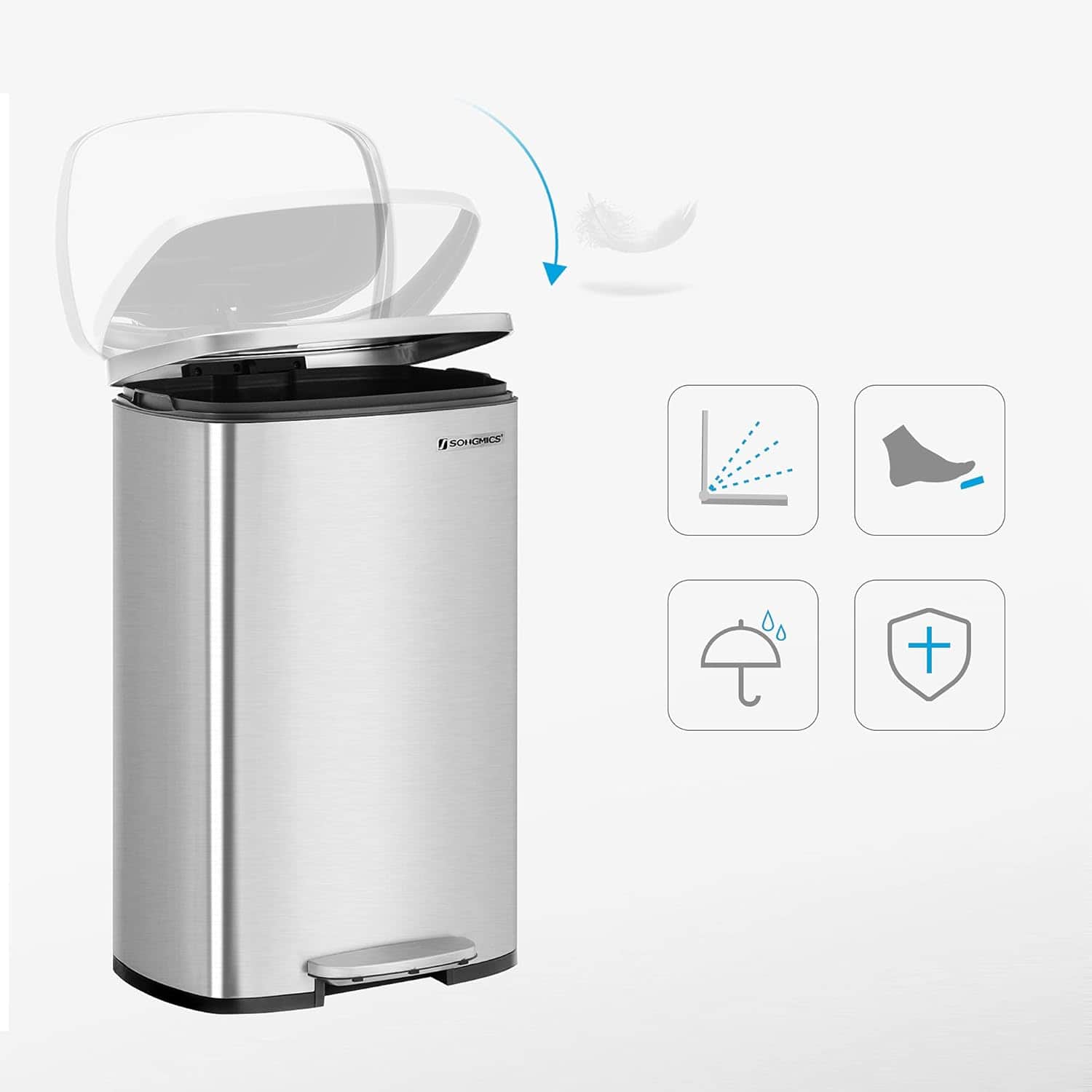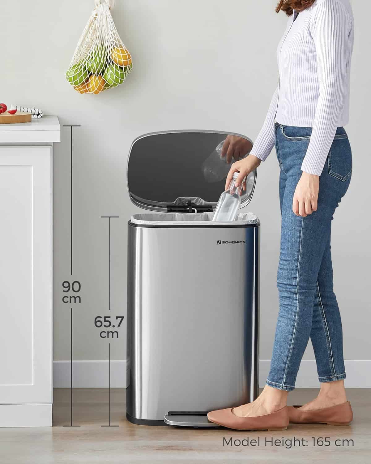 Este usor sa aruncati deseurile! Economisind spatiu, acest cos de gunoi de 50L este suficient de mare pentru obiectele voluminoase, fara a ocupa prea mult spatiu pe podea. Este perfect pentru majoritatea familiilor. Cu o suprafata din otel, un capac cu inchidere moale, o galeata interioara detasabila si o pedala robusta, acest cos de bucatarie este convenabil pentru a va gazdui deseurile zilnice.Culoare: ArgintiuMateriale: Cos din otel, galeata interioara din plasticDimensiunile produsului (fara pedala): 42,5 x 31,8 x 66 cm (L x l x i)Inaltime cu capacul deschis: 93,4 cm.Dimensiuni galeata interioara: 41 x 25 x 58,5 cm (L x l x i)Dimensiuni pedala: 19,5 x 5,8 cm (L x l)Volum: 50 LitriGreutate: 6,2 kg Sfaturi SONGMICS: Acest produs este destinat numai utilizarii in interior. Curatati acest articol cu o carpa moale umeda, daca e nevoie, utilizati un detergent neutru. Pentru a prelungi durata de viata a produsului, nu inchideti capacul cu mana cu prea multa forta. Potrivit pentru majoritatea spatiilor Acest cos de gunoi de bucatarie are un volum de 50L, care este suficient pentru majoritatea gospodariilor. In plus, designul sau modern si elegant se potriveste cu orice stil de decor interior Otel de calitate Fabricat din otel de calitate, acest cos de gunoi este rezistent la rugina si usor de curatat, doar stergeti o carpa mica Soft-close Capacul acestui cos de gunoi se inchide incet si silentios, fara trantiri neplacute Usor de deschis Deschideti cu pedala sau, in caz contrar, deschideti-l complet cu o singura mana, astfel incat capacul sa ramana deschis, astfel incat sa puteti avea si mainile libere pentru acele zile de curatenie mare Galeata interioara convenabila Galeata interioara are o gaura pe spate, design inteligent pentru a instala bine si pentru a evita sa vedeti sacii de gunoi