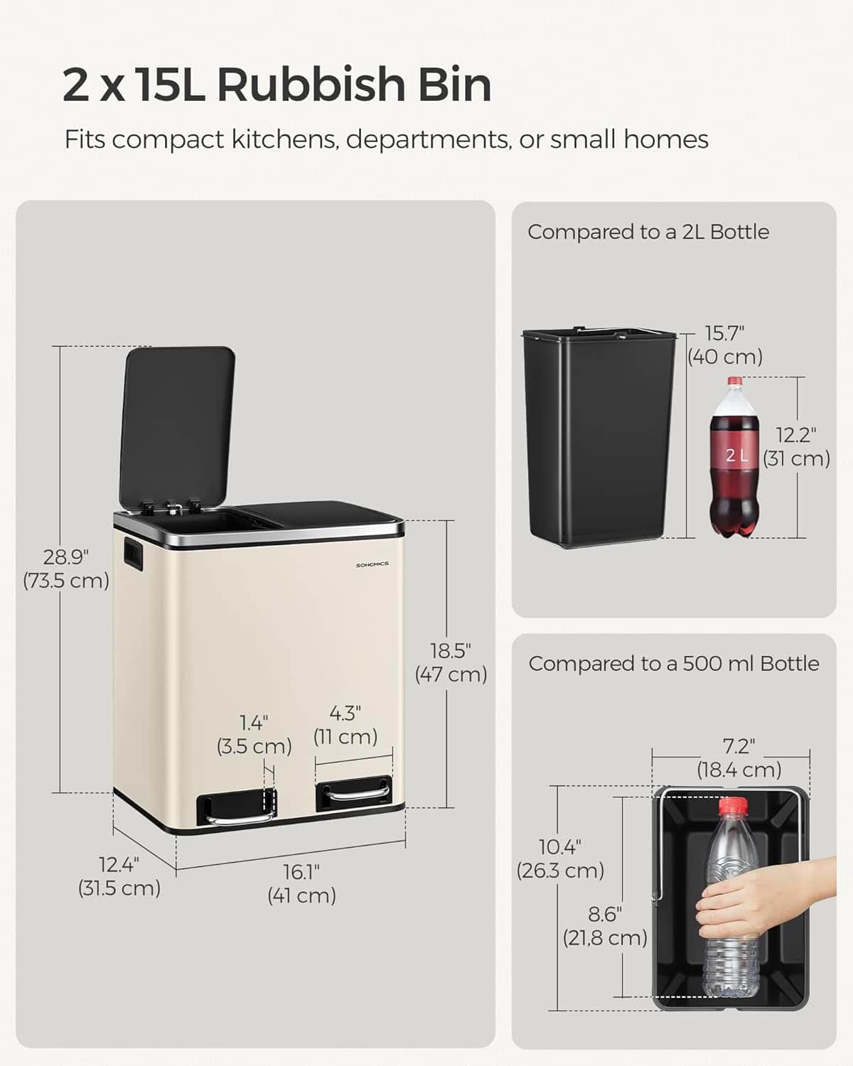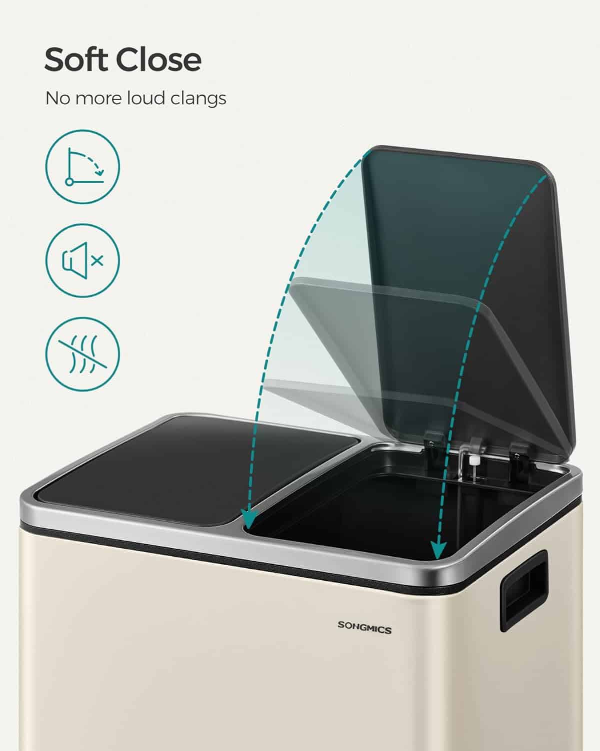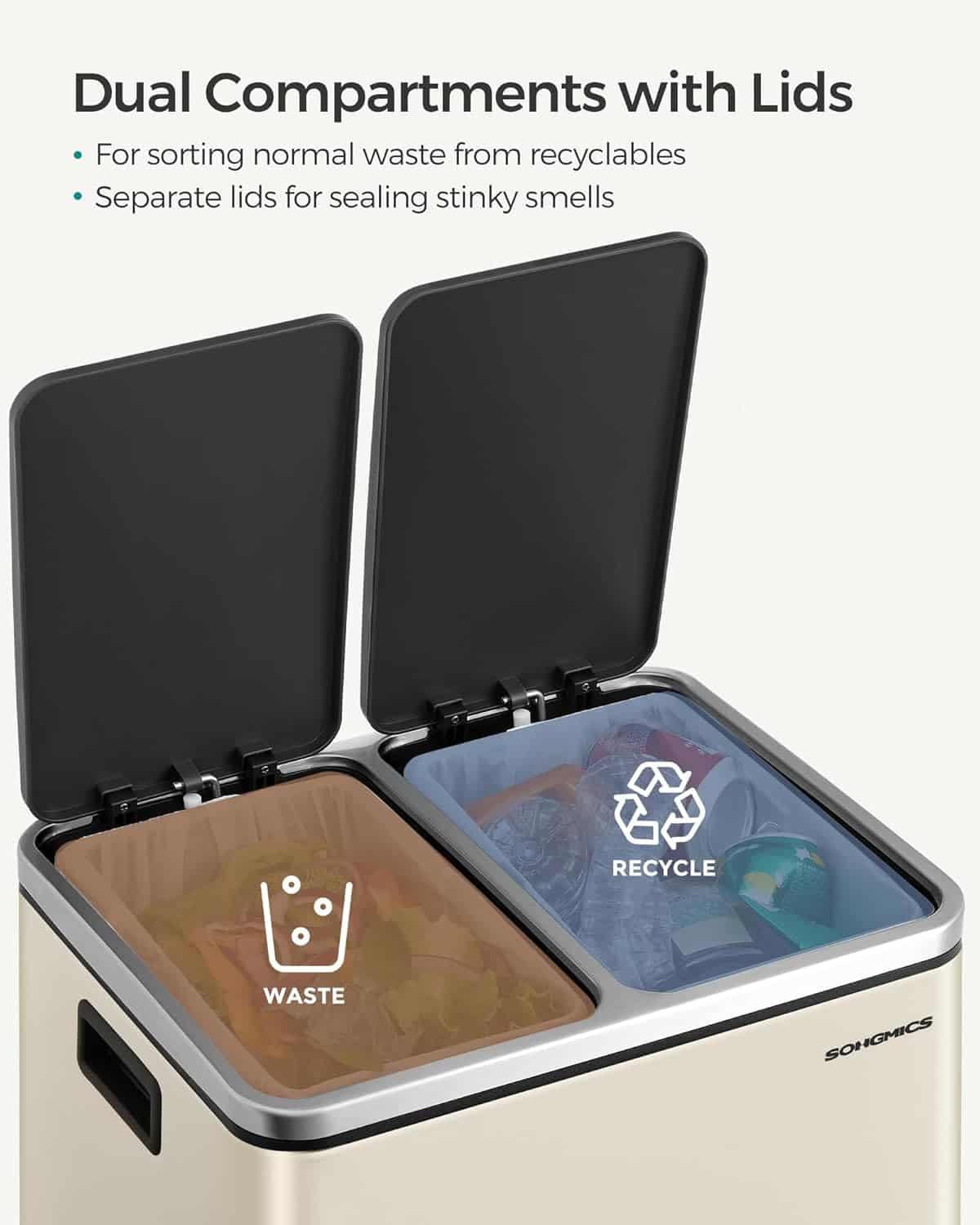 - Ideal pentru bucatarii mici, acest cos dublu de la SONGMICS ofera o solutie eficienta pentru colectarea selectiva a deseurilor. Fiecare compartiment de 15 litri este prevazut cu galeata interioara detasabila si capac individual cu deschidere pe baza de pedala. Constructia din otel inoxidabil si designul modern in nuante de bej si negru il fac usor de integrat in orice decor. Caracteristici principale: 2 compartimente separate pentru reciclare si deseuri menajere