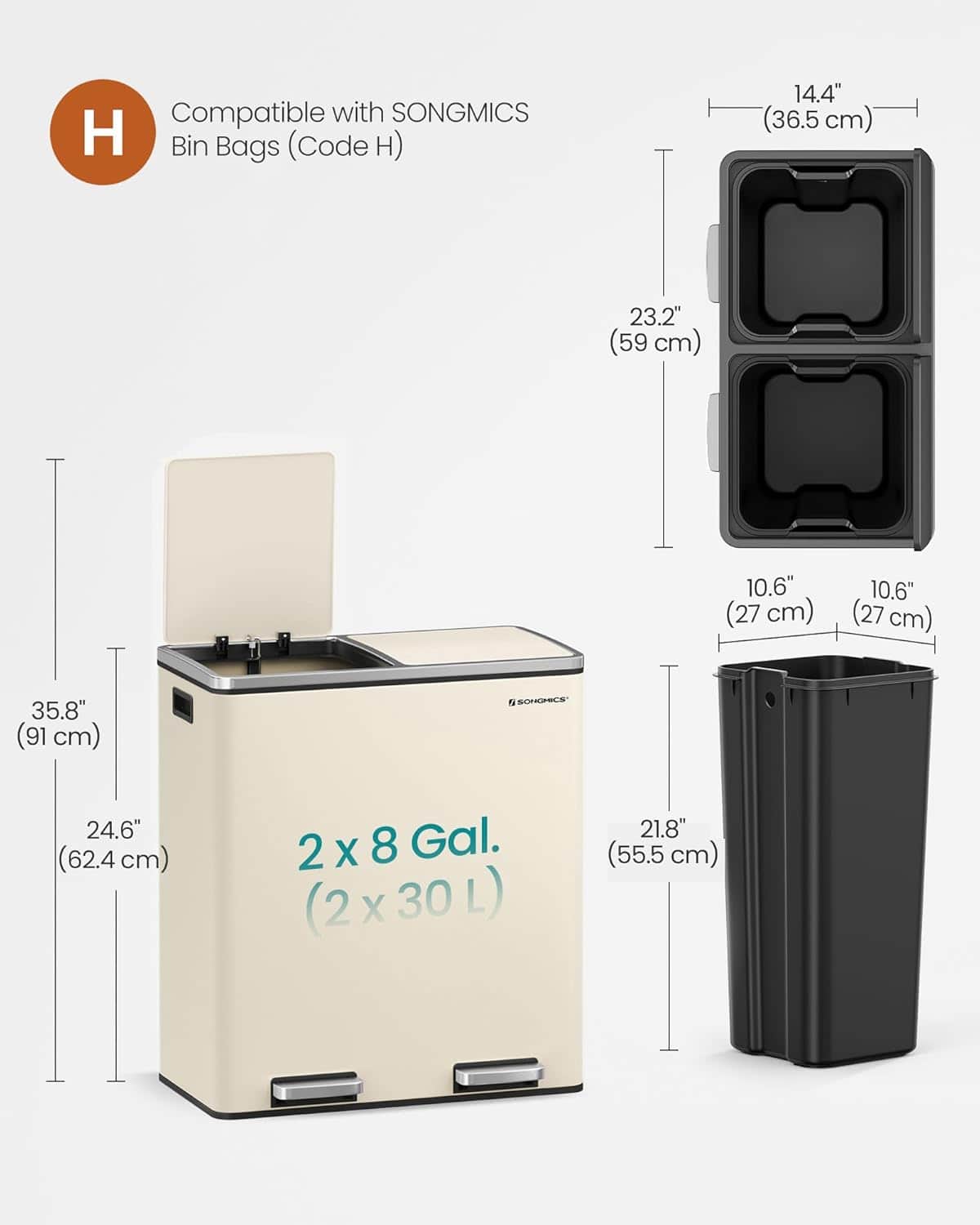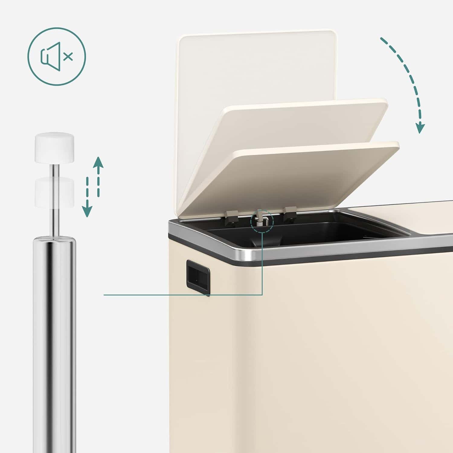 - Cosul de gunoi dublu SONGMICS este alegerea ideala pentru o bucatarie moderna si bine organizata. Cu doua compartimente generoase si deschidere igienica prin pedale, permite sortarea usoara a deseurilor. Designul elegant in nuanta crem se integreaza perfect in orice decor, iar inchiderea silentioasa ofera confort in utilizare zilnica. Caracteristici principale: