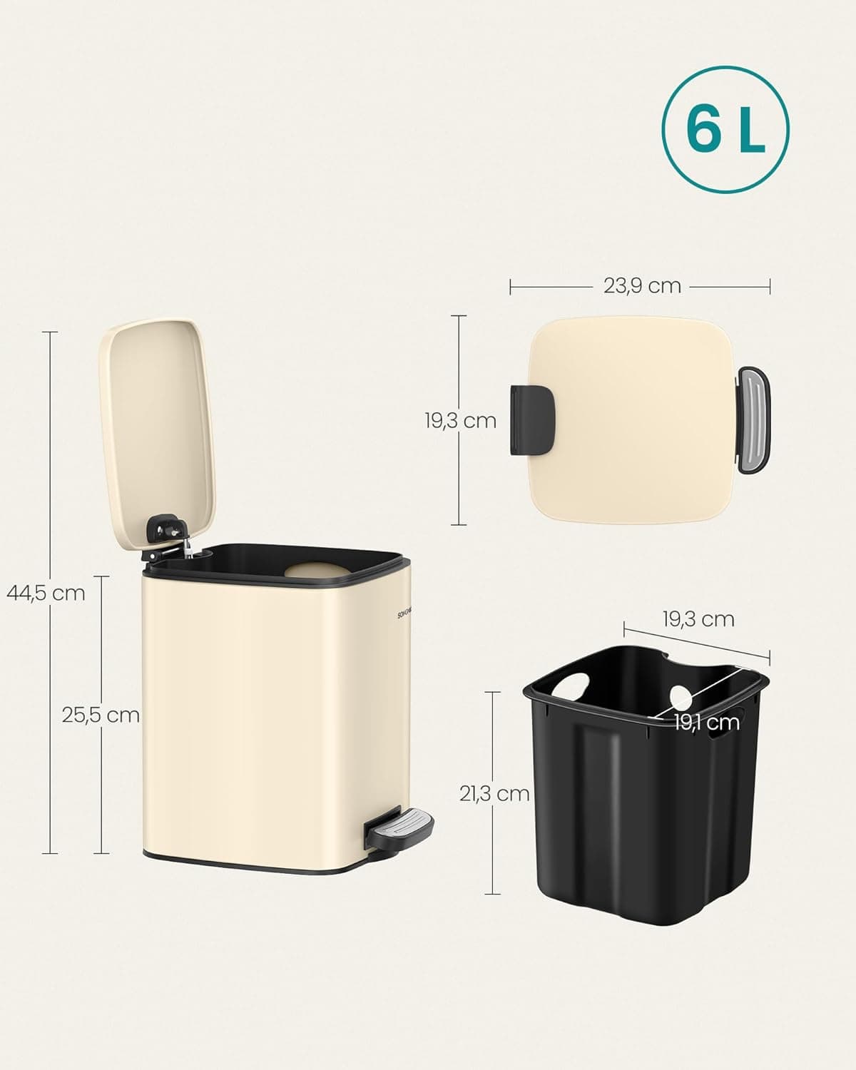 Perfect pentru colturi mici: Datorita dimensiunilor compacte (23,9 x 19,3 x 25,5 cm ( Lxlxi), acest cos de gunoi de 6 litri se potriveste perfect in spatii mici.