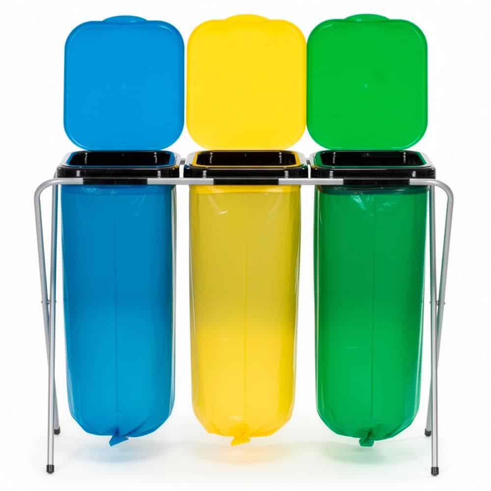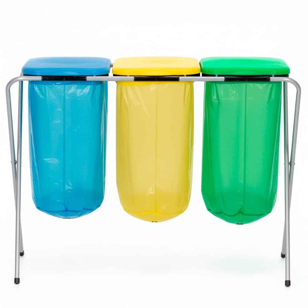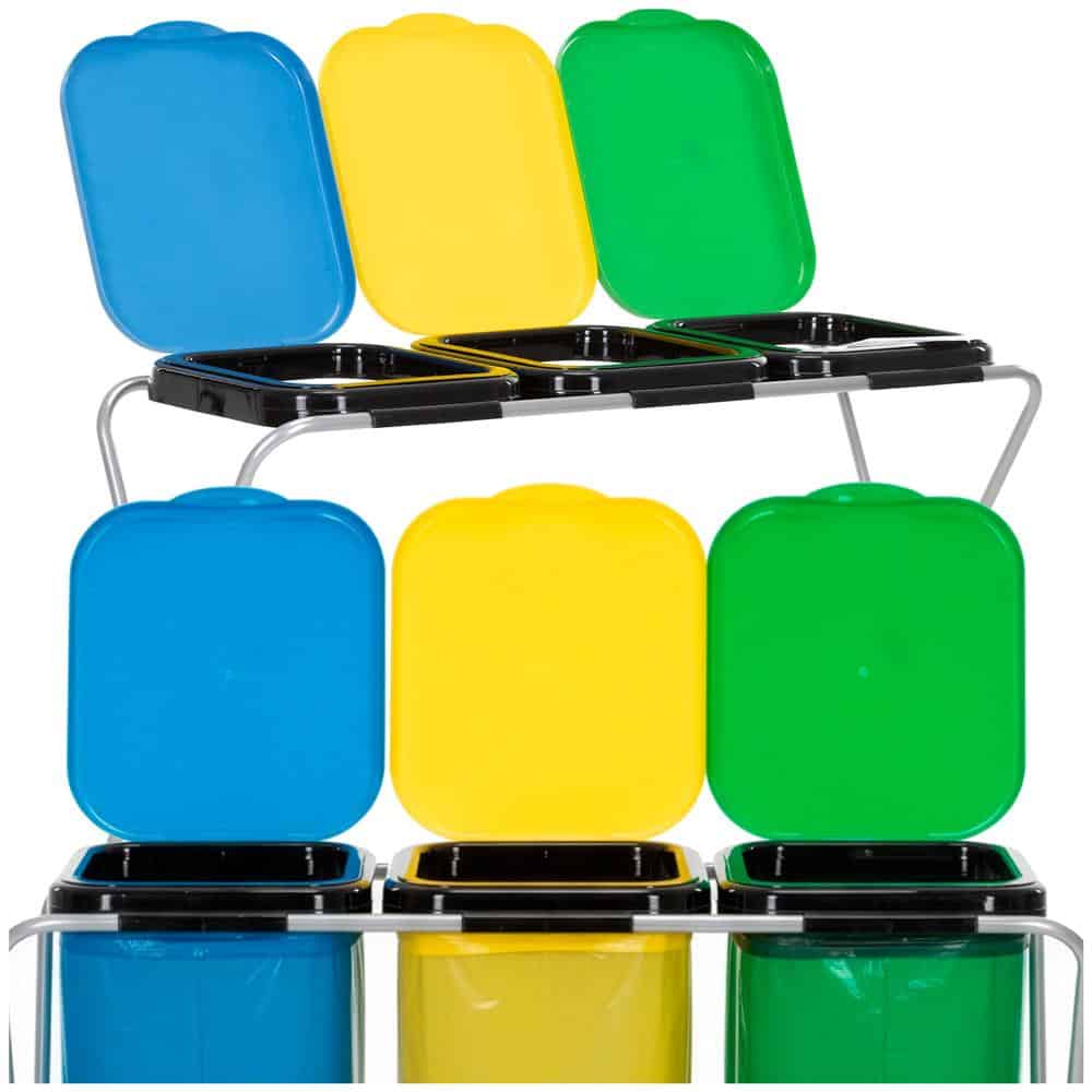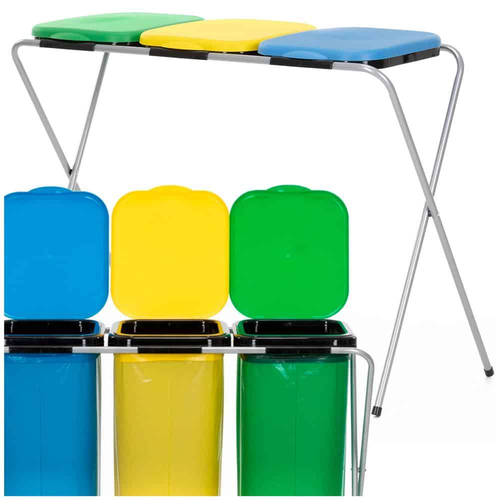 Cos de gunoi selectiv cu 3 compartimente, cadru metalic si capace PP, 98x42x74 cm Mob360 – produs disponibil în magazinul Mob360.