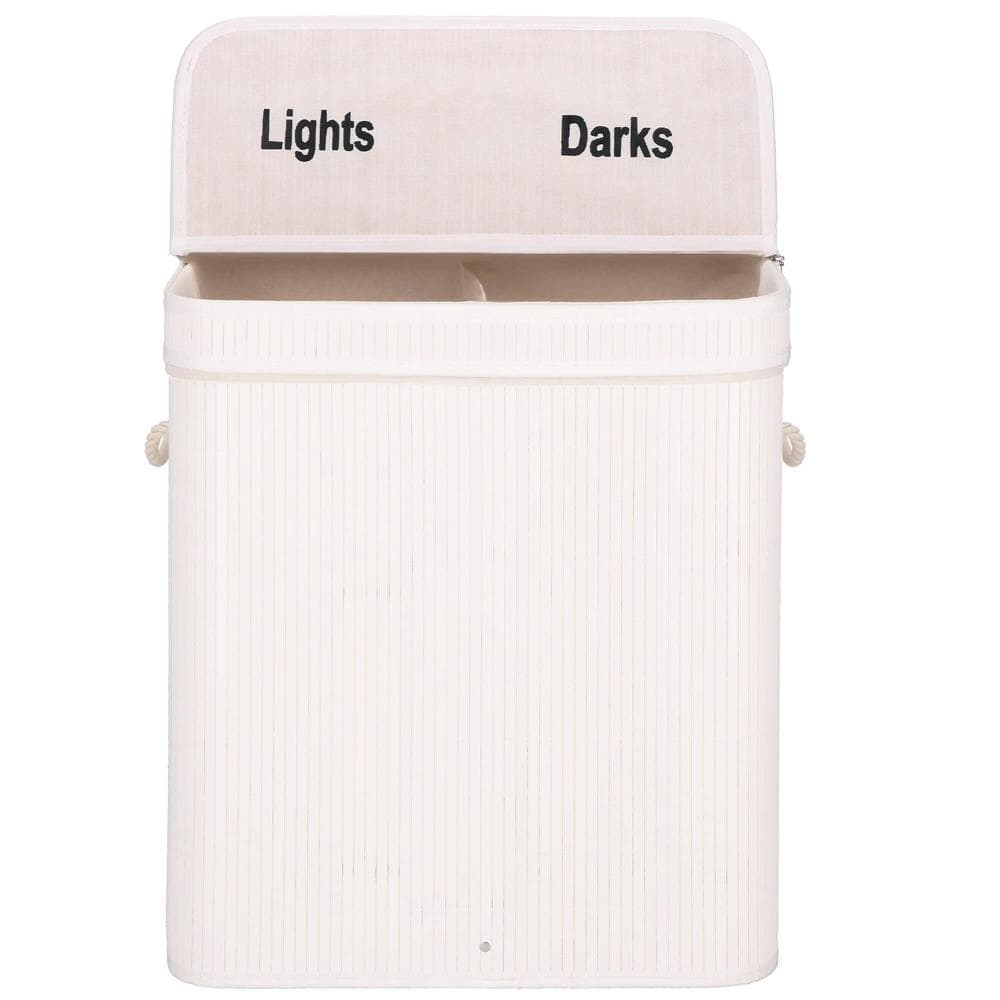 Cos de rufe din bambus cu capac, 2 compartimente, sac detasabil, volum 100L, 54x35x60cm, alb Mob360