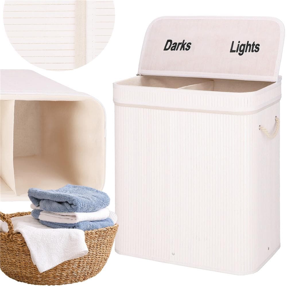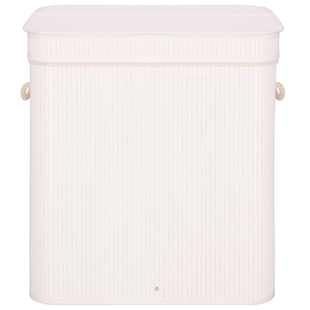 Cos de rufe din bambus cu capac, 2 compartimente, sac detasabil, volum 100L, 54x35x60cm, alb Mob360 – produs disponibil în magazinul Mob360.