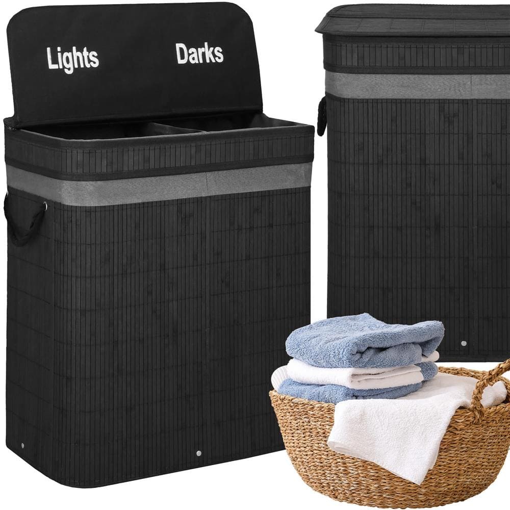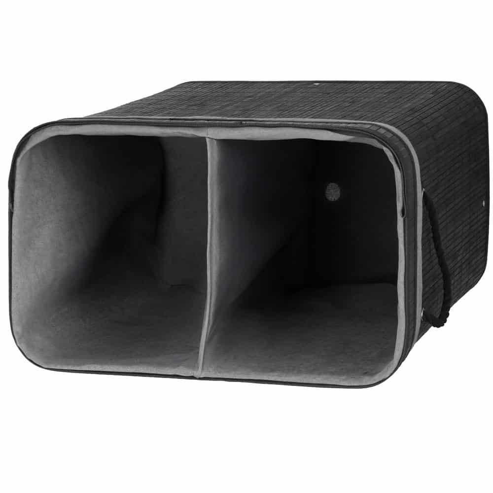 Cos de rufe din bambus cu capac, 2 compartimente, sac detasabil, volum 100L, 54x35x60cm, negru Mob360