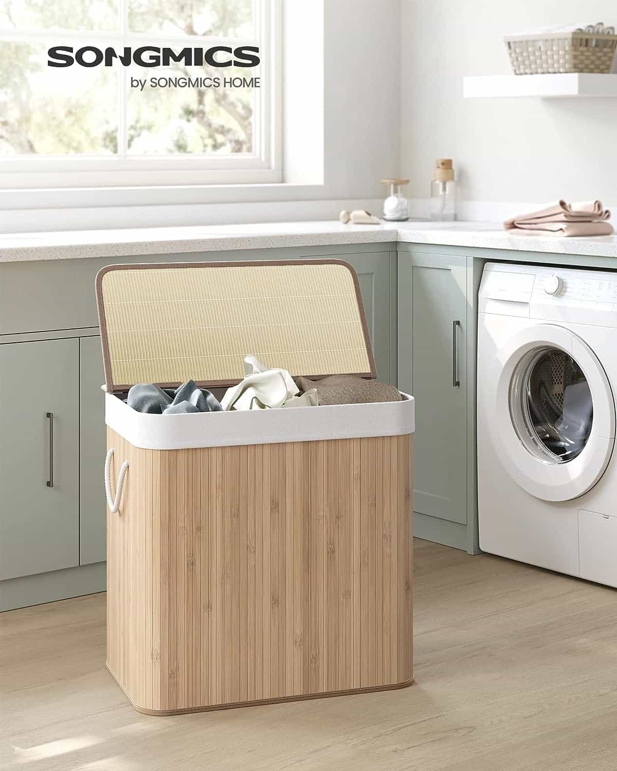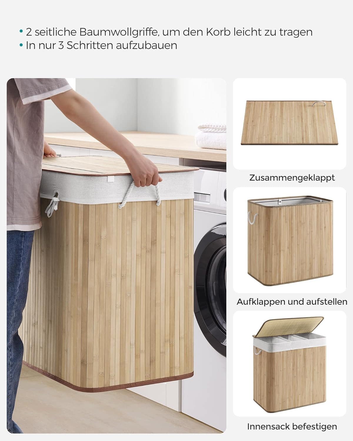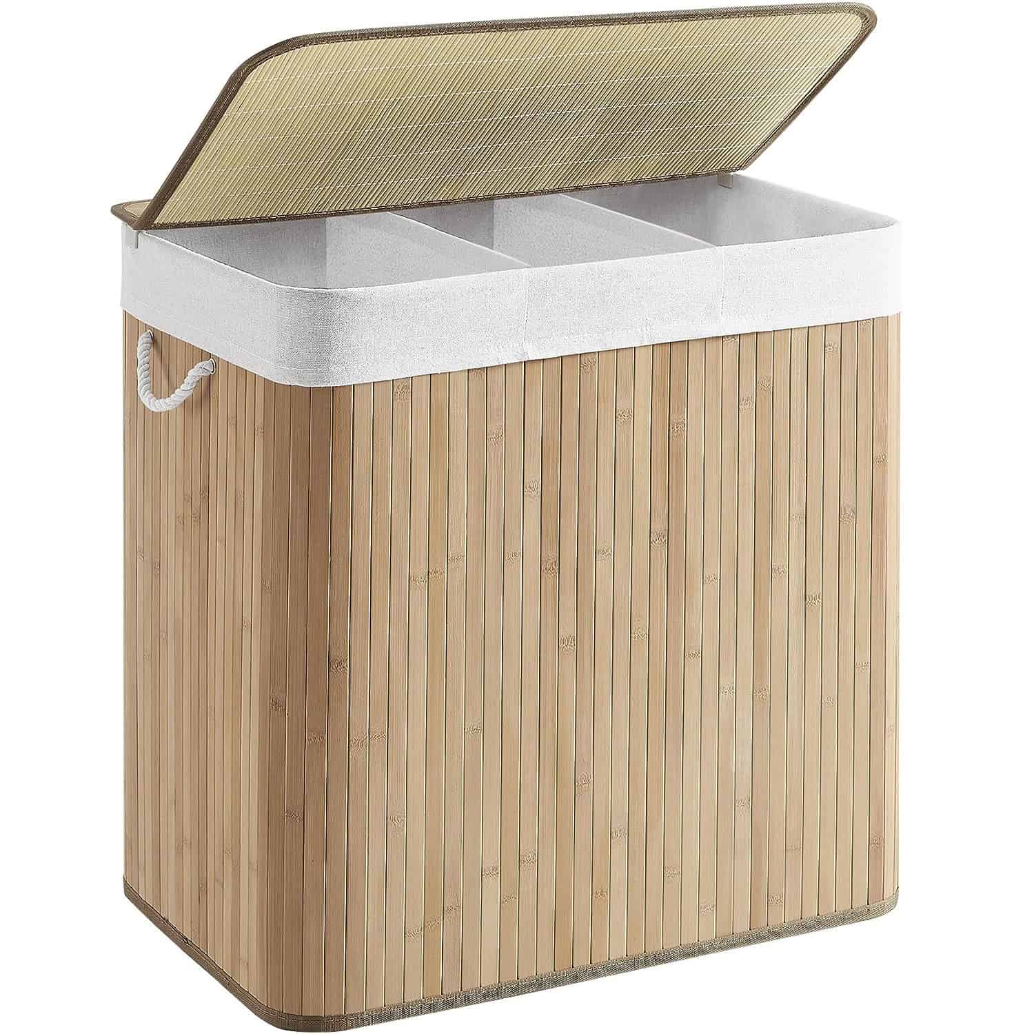 Continutul cutiei: un cos de rufe de 150 de litri cu 3 compartimente de la Songmics, care este fabricat din bambus robust si ofera mult spatiu de depozitare pentru rufele murdare si lenjeria de pat.