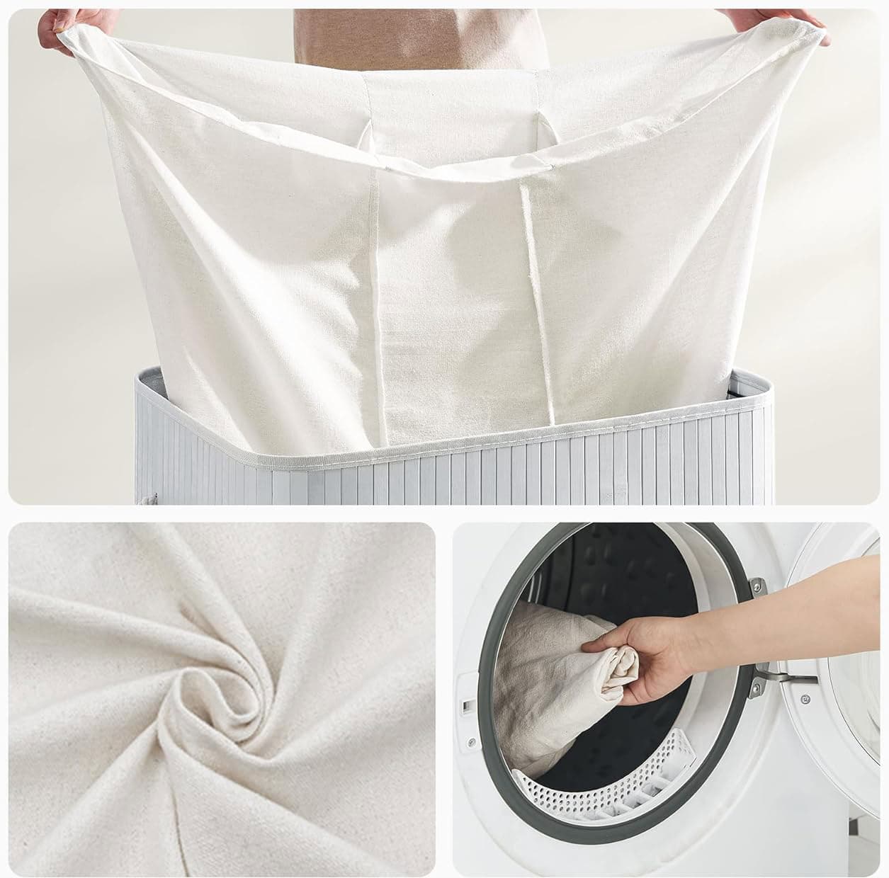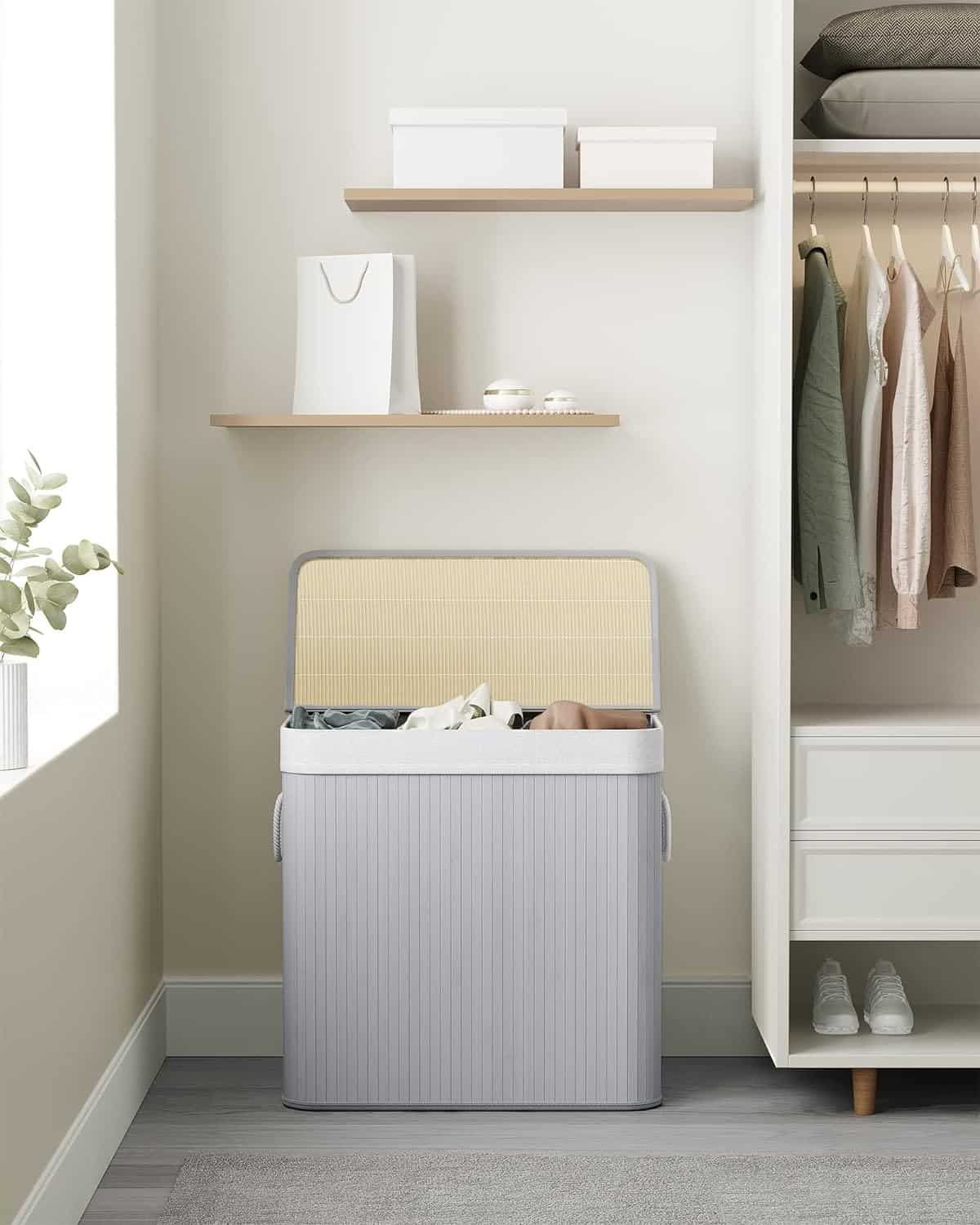 Cos de rufe din bambus, pliabil, cu captuseala detasabila lavabila, 3 compartimente, 150L, 60x40x62cm, gri Mob360 – produs disponibil în magazinul Mob360.