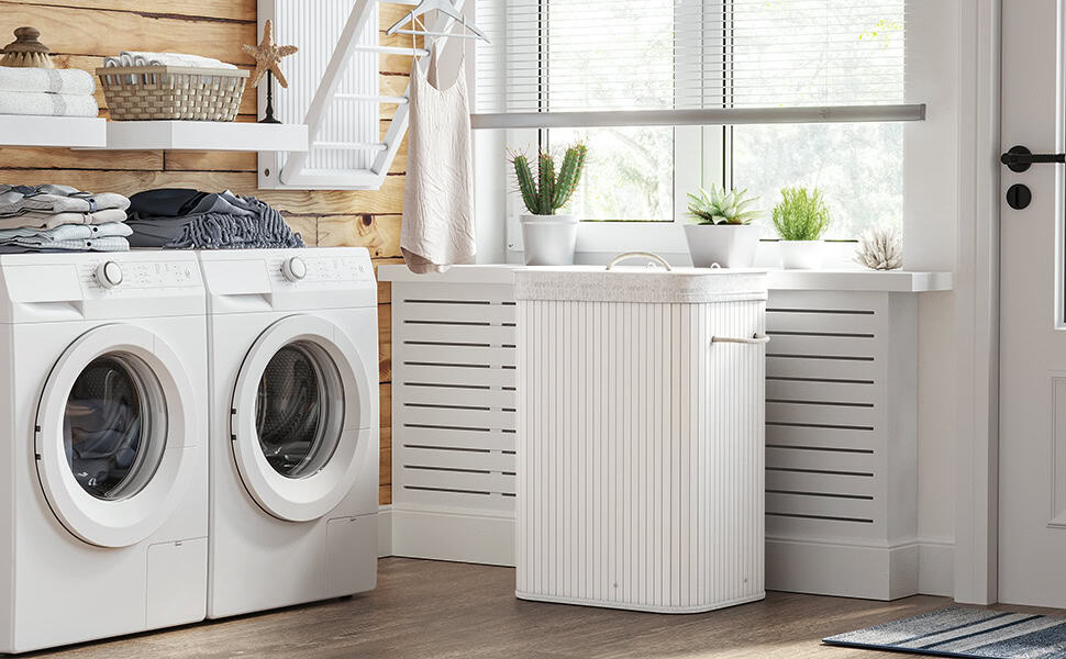 Cos de rufe din bambus, pliabil, cu captuseala detasabila lavabila, 72L, 40x30x60cm, alb Mob360