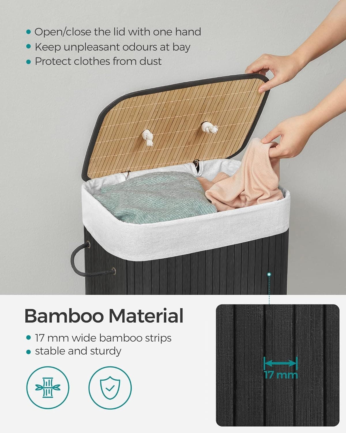 Rezistent si pliabil: Benzile de bambus latime de 17 mm fac cosul de rufe foarte robust, stabil si rezistent (incarcare maxima 20 kg).