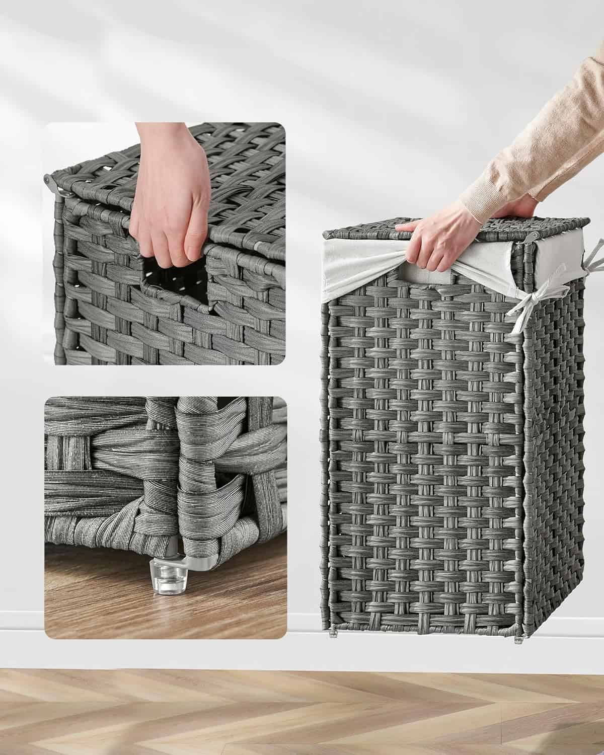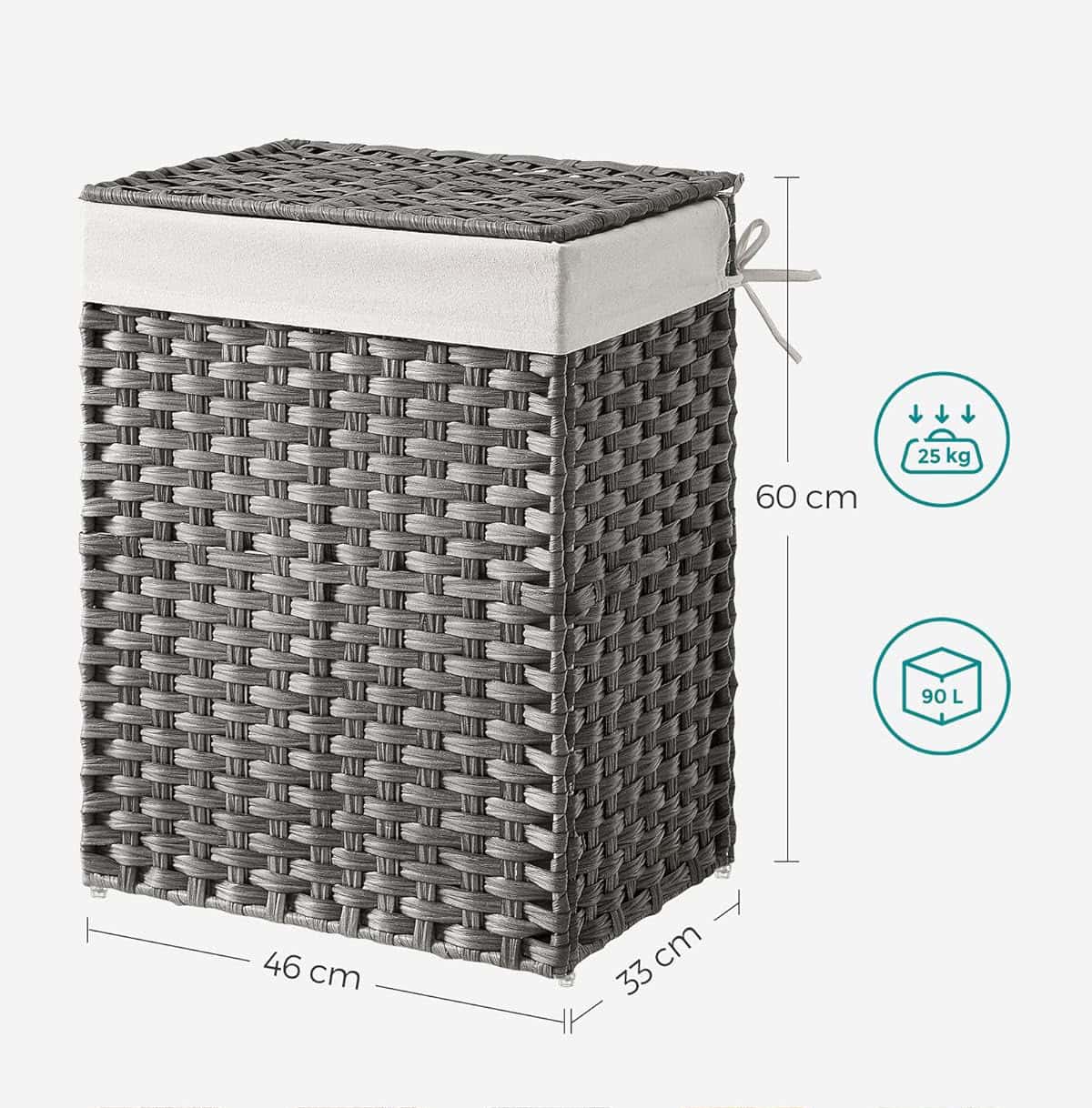Cos de rufe din ratan sintetic cu capac, sac detasabil, volum 90L, 46x33x60cm, gri Mob360 – produs disponibil în magazinul Mob360.