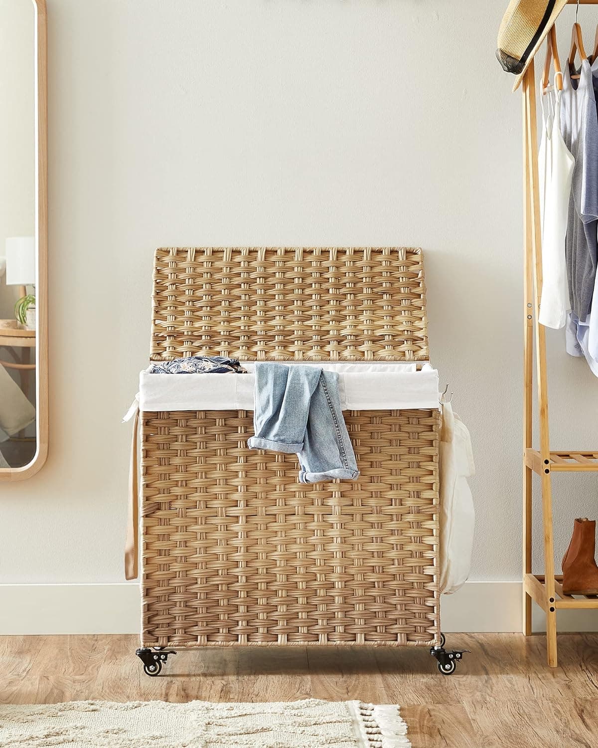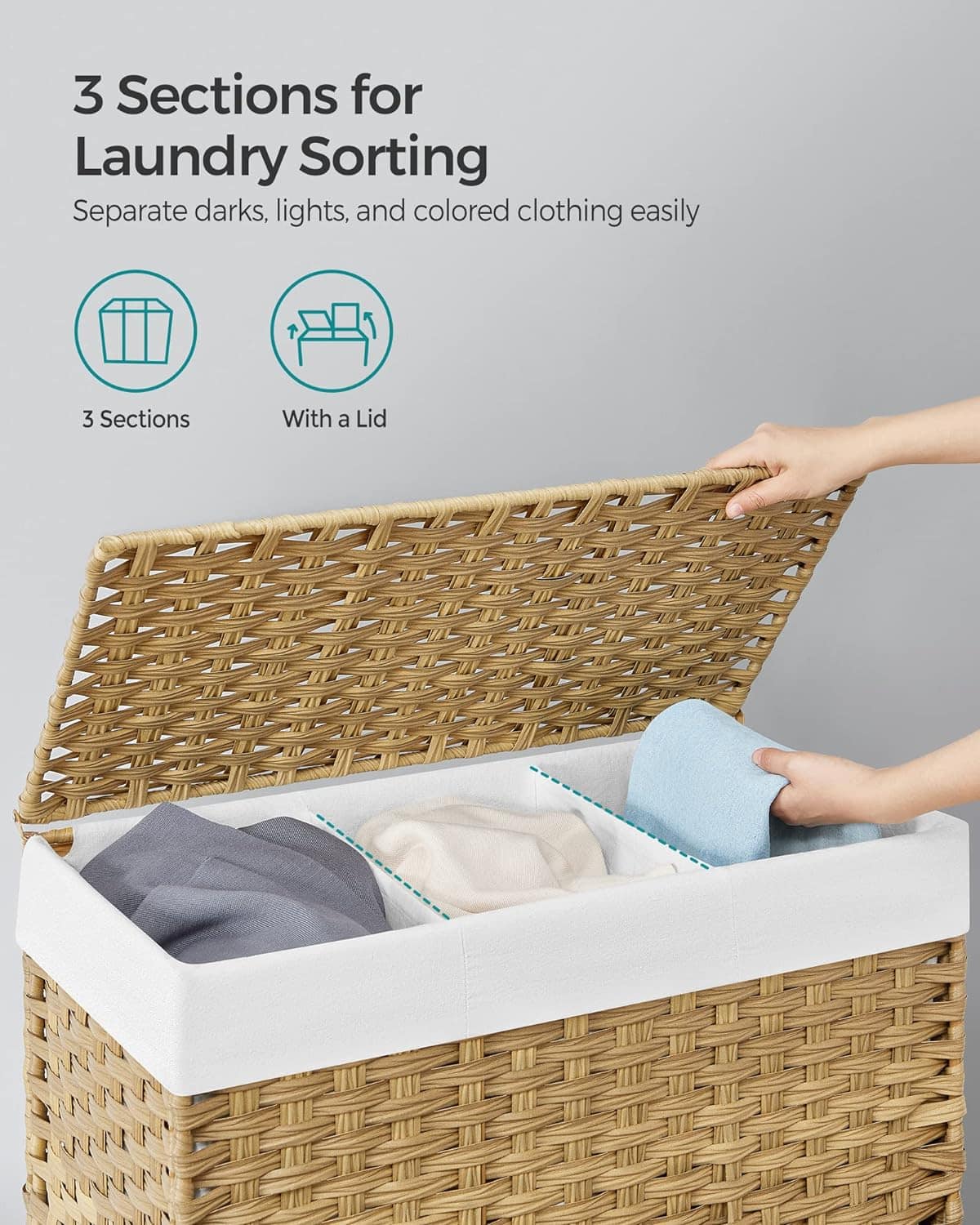 Specificatii: Culoare: Natural Material: Plastic PP (polipropilena), cadru metalic, sac de bumbac Dimensiunea produsului: 66x 33 x 60 cm (L x l x a) Greutatea produsului: 3,5 kg Capacitate de incarcare statica: 30 kg Despre acest articol Capacul cosului de rufe poate fi deschis si inchis cu o singura mana. Este atat de comod sa il inchideti dupa ce ati pus rufele. Capacul previne mirosurile neplacute si protejeaza impotriva prafului.Acest cos de rufe care masoara 66 x 33 x 60 cm (L x l x i) are un volum de 140 de litri. Cele 3 compartimente va permit sa va sortati rufele dupa culoare sau material.Suprafata din plastic PP din imitatie de rattan este impermeabila si respirabila. Aceast cos de rufe va pastreaza hainele uscate. Cu un cadru metalic, este stabil si suporta pana la 30 kg.Husa din bumbac gros de 160 g/m² este detasabila. Acesta poate fi indepartata cu usurinta pentru a fi dusa la spalatorie sau pusa direct in masina de spalat. Este prevazuta o punga pentru lenjeria de corp.Aceast cos de rufe este echipata cu 4 roti, (doua cu frane). Este atat de convenabil sa il mutati sau sa il tineti pe loc. Rotile pot fi inlocuite cu picioare fixe. O curea lunga faciliteaza deplasarea.