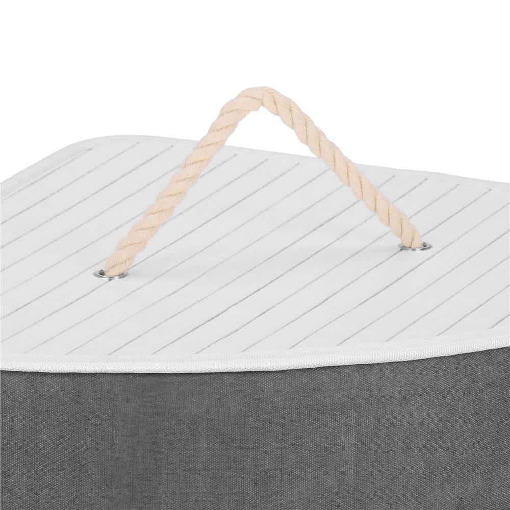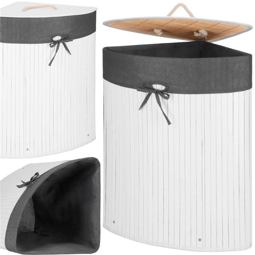 Cos de rufe triunghiular pentru colt cu capac, bambus si sac textil detasabil, 60 litri, 55x35x60 cm, alb si gri Mob360